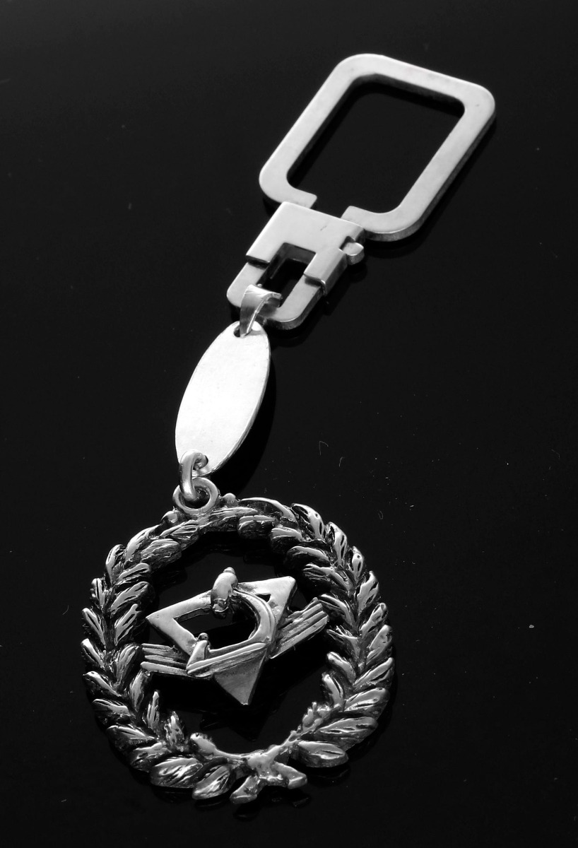 Esta formado por una lira lisa acabado brillo con cierre de alta seguridad de la que cuelga un motivo laureado rodeando el anagrama de la carrera de optica. la cadena que une motivo y lira dispone de una chapita donde poder grabar un nombre y una fecha.