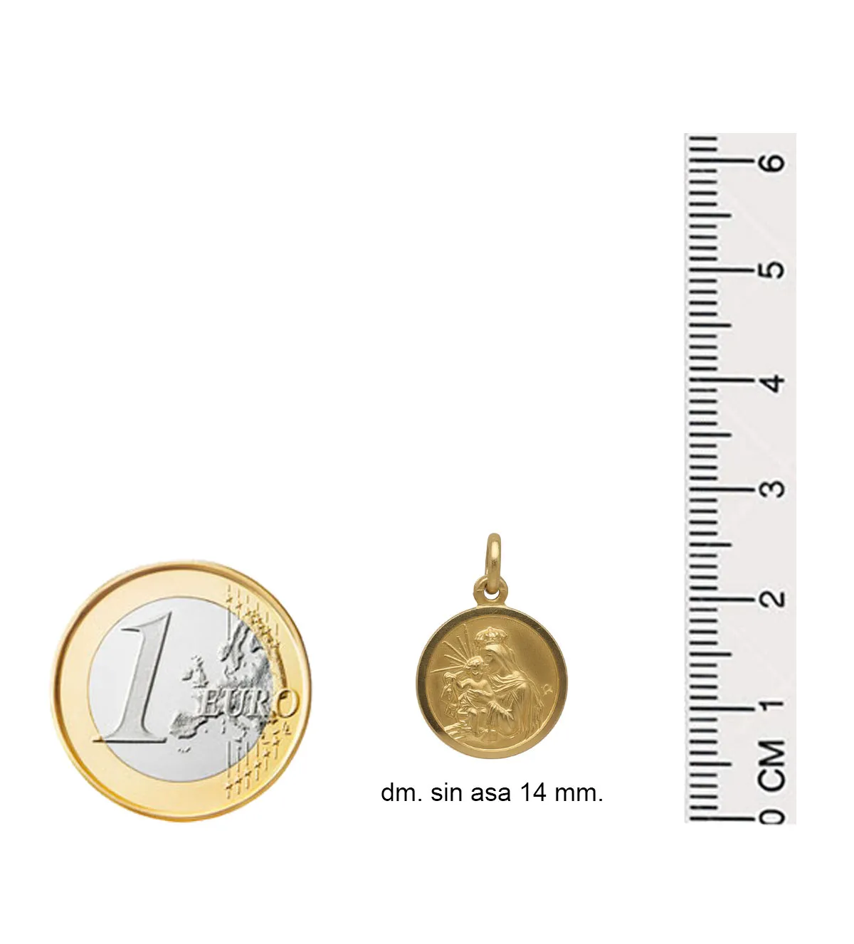 La medalla tiene un diámetro de 14 mm sin asa, un tamaño ideal para quienes buscan una joya discreta pero visible. Gracias a estas dimensiones, puede llevarse cómodamente en cadenas finas o medias, adaptándose a diferentes estilos y preferencias.