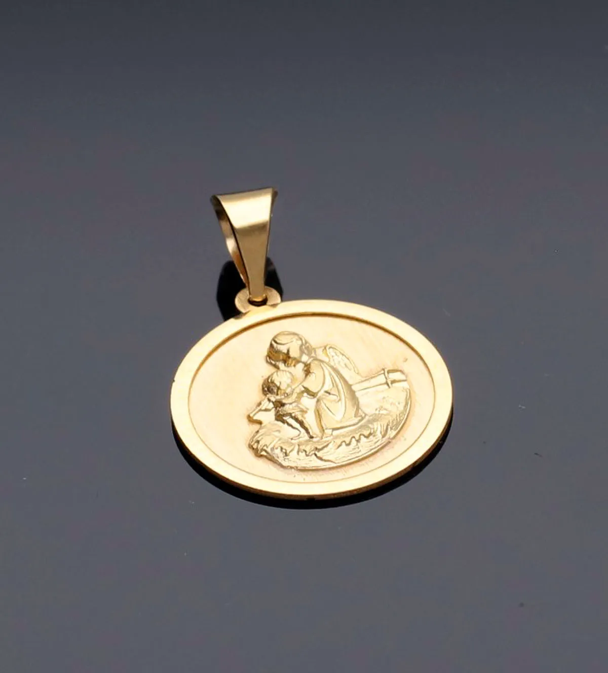 Esta medalla está fabricada en oro de 1ª ley de 18 kilates, garantía de pureza, durabilidad y resistencia. El acabado matizado aporta una textura aterciopelada que contrasta armoniosamente con los bordes biselados, creando un juego de luces que resalta cada detalle del ángel protector.