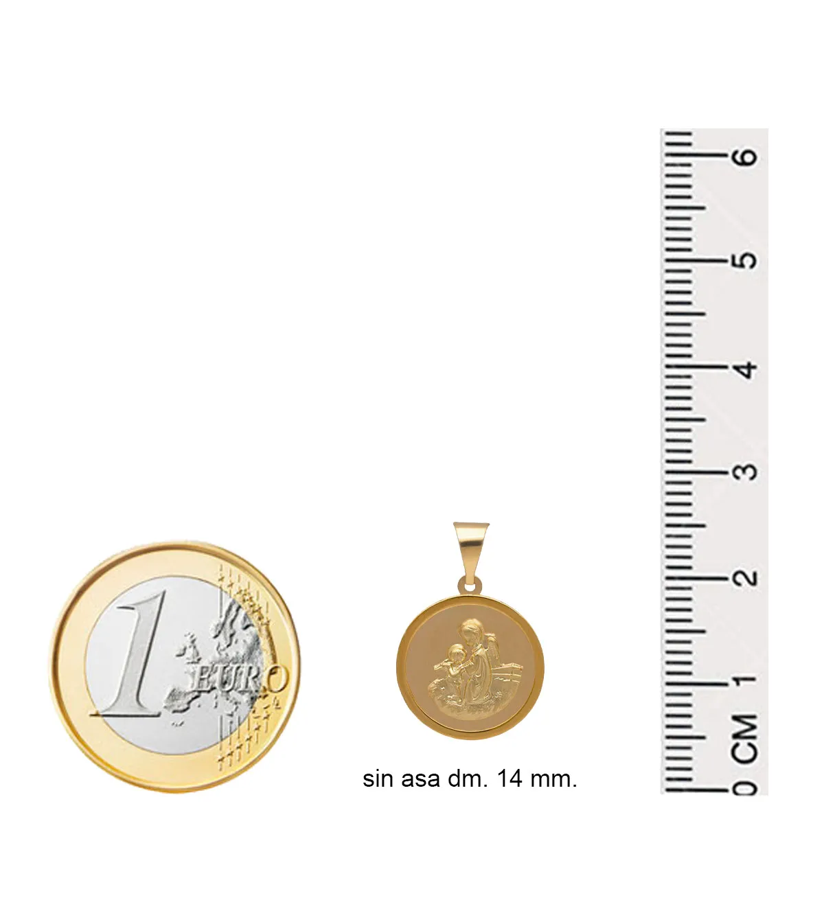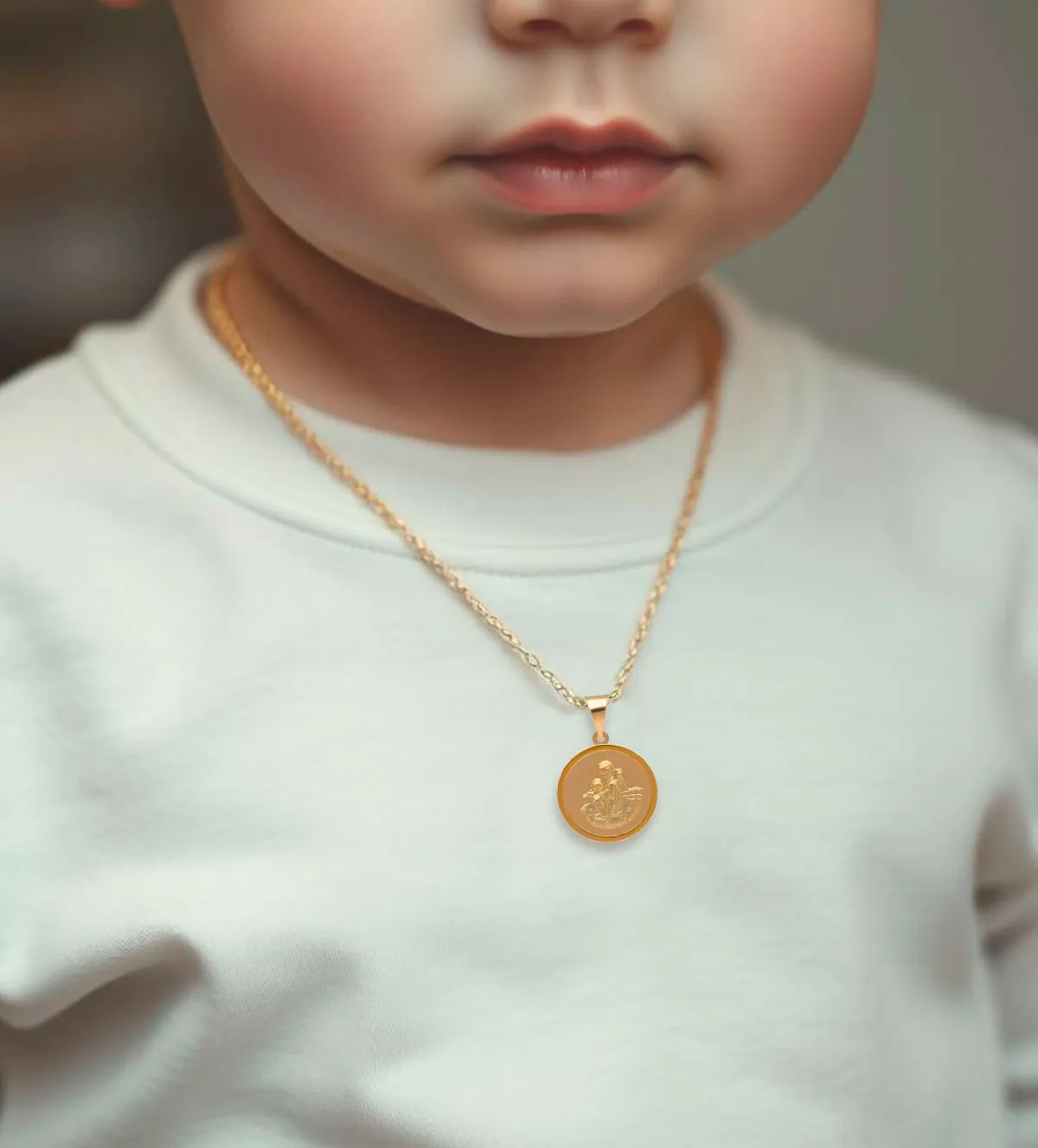 Con un diámetro de 14 mm y un peso aproximado de 1,30 gramos, esta medalla es ligera y cómoda de llevar. Su tamaño la hace ideal para niños pequeños, sin dejar de ser lo suficientemente visible como para destacar. Puede combinarse con cualquier tipo de cadena fina de oro, tanto lisa como con diseño, y adaptarse al largo necesario para bebés o niños mayores.