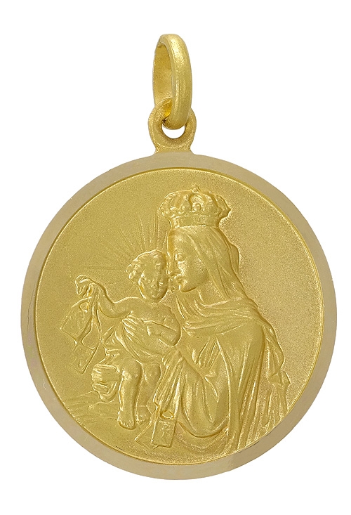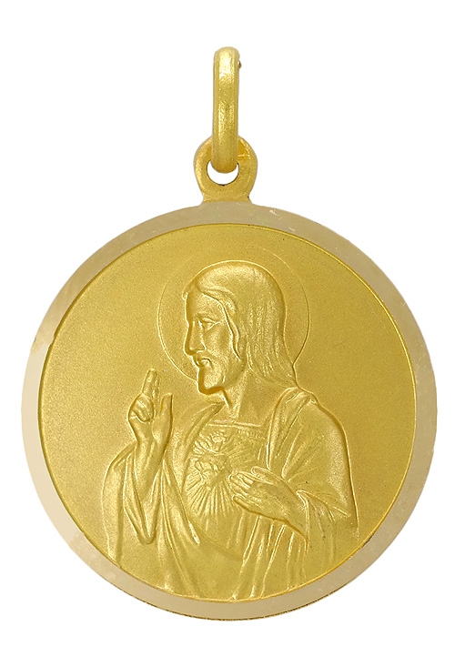 Medalla escapulario de oro amarillo matizado de 18 kilates con un peso aproximado de 5.10 gramos, con las imágenes del Sagrado Corazón y de la Virgen del Carmen, es una medalla redonda con un bisel lapidado y brillo exterior con un diámetro de 24 milímetros y un asa de hila en la parte superior de las imágenes.