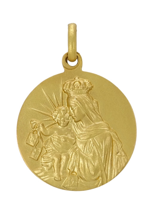 Medalla escapulario de oro amarillo de ley de 18 kilates, esta matizada con las figuras del Sagrado Corazón y la Virgen del Carmen en una esfera que tiene de diámetro 22 milímetros con un asa de hilo en la parte superior de estas imágenes, tiene un peso aproximado de 4,50 gramos y es un perfecto regalo de cumpleaños, santo, comunión, bautizo, etc…