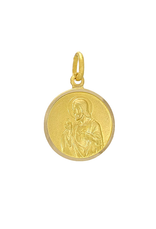 Medalla Escapulario con las imágenes de Nuestra Señora del Carmen y el Sagrado Corazon de Jesus, es una medalla matizada de oro de ley de 18 kilates con un diámetro de 14 milímetros, consta de un cerco liso alrededor del mismo y va acompañado de un asa de hilo en la parte superior de ambas imágenes, esta medalla tiene un peso aproximado a 1,60 gramos.