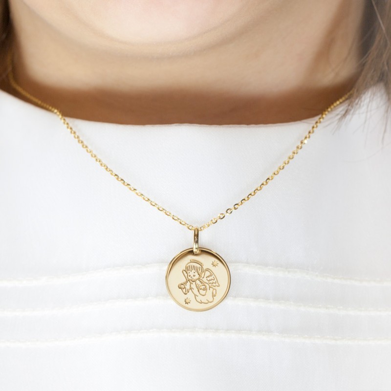 Medalla de oro de 18 kilates forma circular de 16 mm de díametro, con dibujo de un angelito volando entre estrellas, elaborado con láser. Acabado en brillo con efecto espejo con peso de 1,30 gramos y es un regalo perfecto de niña en cualquier ocasión, nacimiento, bautizo, cumpleaños o incluso Comunión.