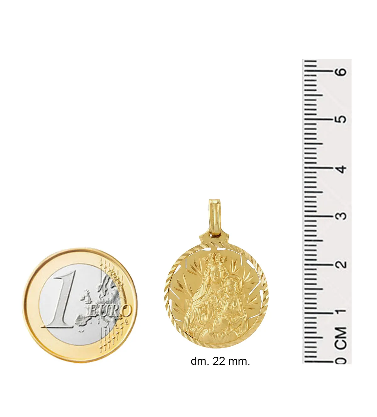 La medalla tiene un diámetro de 22 mm, lo que la convierte en un tamaño intermedio ideal tanto para mujeres como para hombres. Su peso de 3,85 gramos le da presencia sin ser pesada, y permite combinarla con cadenas finas o medianas sin perder protagonismo.