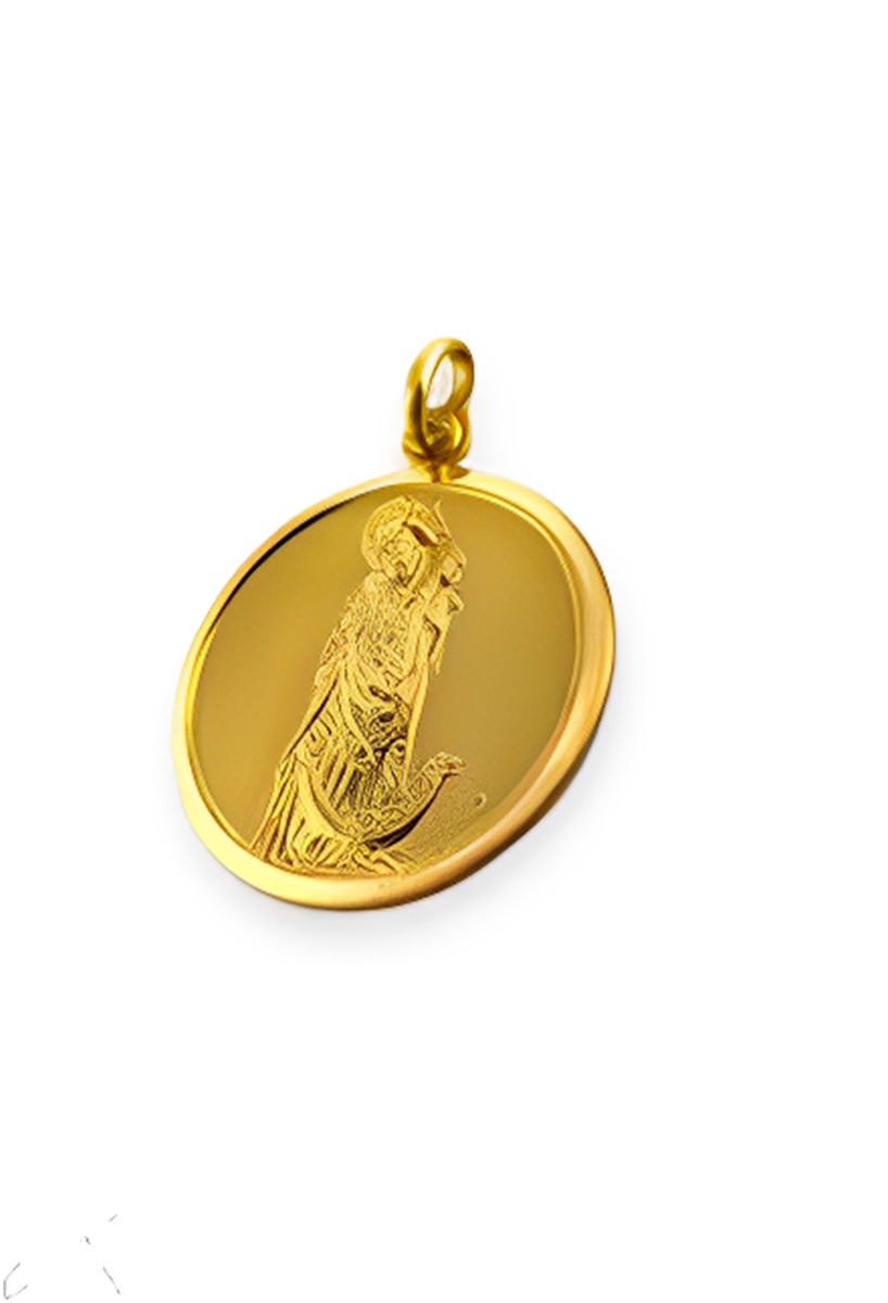 Virgen de la Luz representada en medalla de oro amarillo de primera ley 18 ktes. de forma circular con bisel, Nuestra mujer de la Luz Coronada es una advocación de la Virgen María que se venera en el Santuario de la Virgen de la Luz situado en la Dehesa de las Caheruelas a ocho kilómetros de la ciudad de Tarifa (España), mide 22 mm. y pesa 4,40 gramos. El mejor regalo para los devotos de esta Virgen y las Lucias