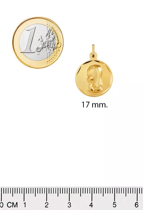Medalla oro Virgen Niña, Bonita medalla de oro amarillo, es una obra maestra que representa a la Virgen Niña en todo su esplendor, con un diámetro de 17 mm y fabricada con oro amarillo de 18 quilates, esta pieza es un lujo entre los detalles religiosos. Perfecta para lucirla en cualquier ocasión especial o para regalar a la recien nacida o a la niña que hace su Primera Comunión, esta medalla le hará sentirse protegida por la mirada amorosa de la Virgen. No pierdas más tiempo y asegúrate ya tu Medalla Oro 18k Virgen Niña, el complemento perfecto para quienes buscan exclusividad y elegancia en cada detalle de sus vidas.