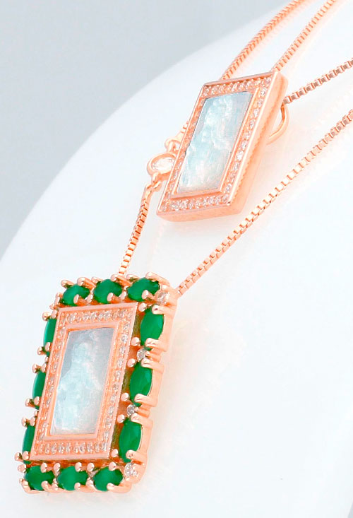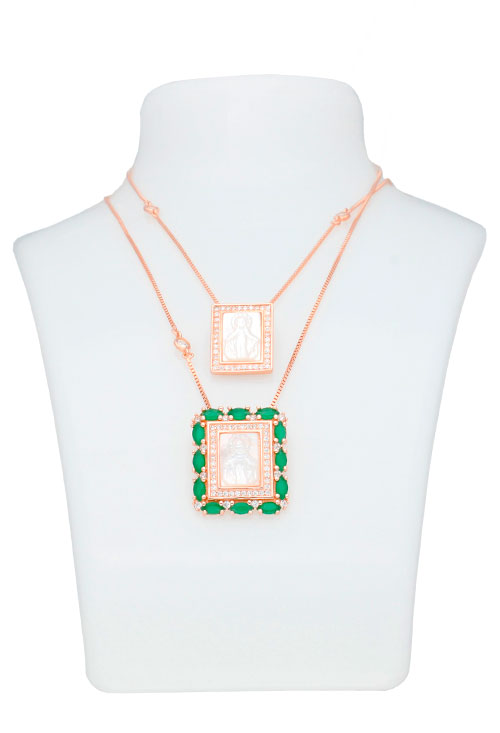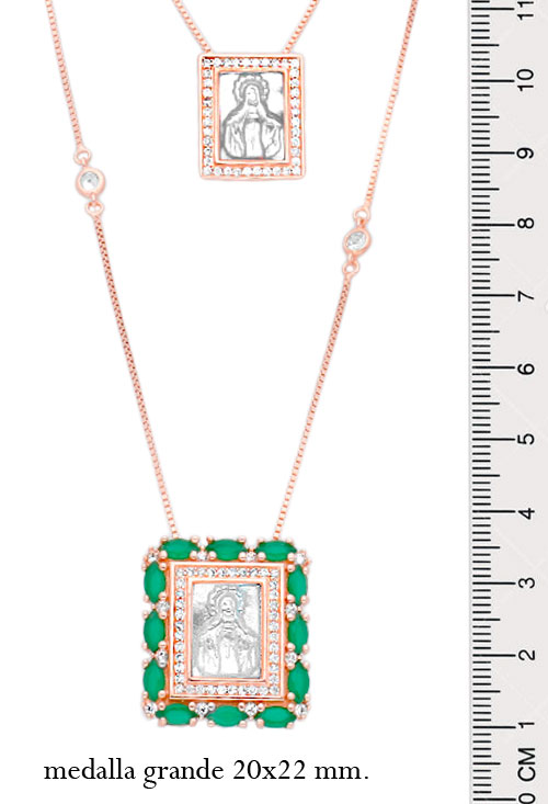 Medalla de plata chapada escapulario 2 medallas y cadena, por escapulario se entiende dos piezas asociadas a la Iglesia Católica, en este caso dos medallas unidas por una cadena que a modo de escapulario monacal se puedan llevar colgando a la vez una sobre la espalda y la otra sobre el pecho. Esta realizado con plata de ley chapada en color rosa y las imágenes son camafeos de madre perla representando dos imágenes diferentes de la Virgen Milagrosa, ambas medallas son rectangulares, el de mayor tamaño con doble orla de circonitas y piedras de cristal checo tono verde y el que va a la espalda más pequeño solo orla de circonitas, la cadena modelo veneciano esta adornada con entrepiezas de circonitas, una joya singular perfecta para llevar asociando a una promesa o ideal como regalo para dar protección a quien se le regala.