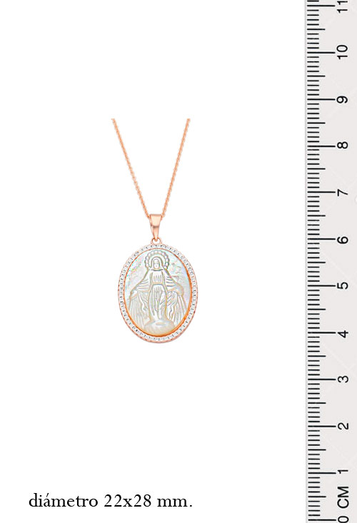 Medalla de plata chapada en color oro rosa imagen de nácar trabajo de camafeo representando la imagen de la Virgen Milagrosa, la medalla esta rodeada por una orla de circonitas engastadas en garras individuales y se cuelga de una cadena igualmente de plata chapada en rosa y que viene incluida a través de un asa de escudo.
