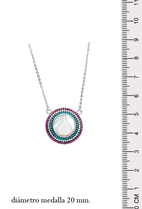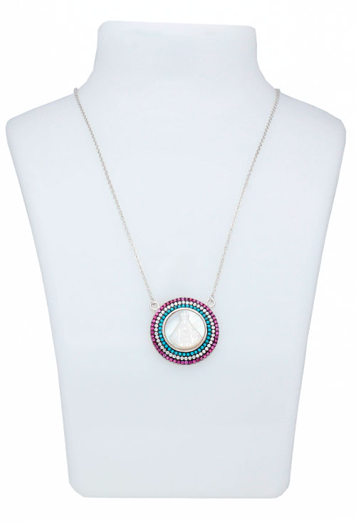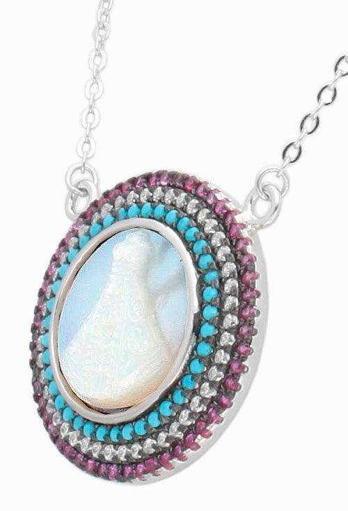 Medalla de plata imagen de nácar orlada cristales checos multicolores, bonito diseño en el que una medalla camafeo de nácar ovalado esta trabajado con la imagen de la Virgen Milagrosa y rodeado por una orla de triple galería con circonitas y cristales checos de color verde y rojo, la medalla se sirve con una cadena de plata modelo forzado plano con cierre de reasa. Precioso como regalo con el que siempre recordará ese momento especial.