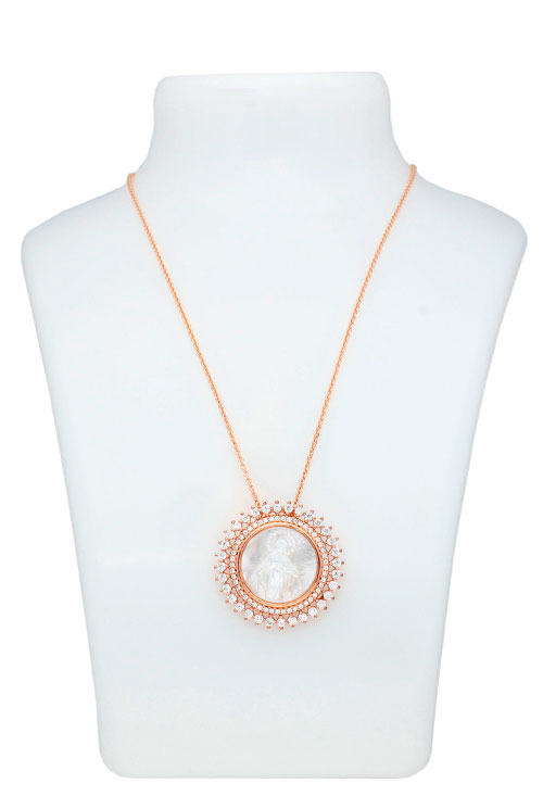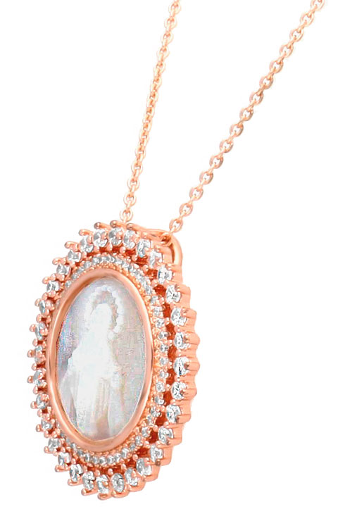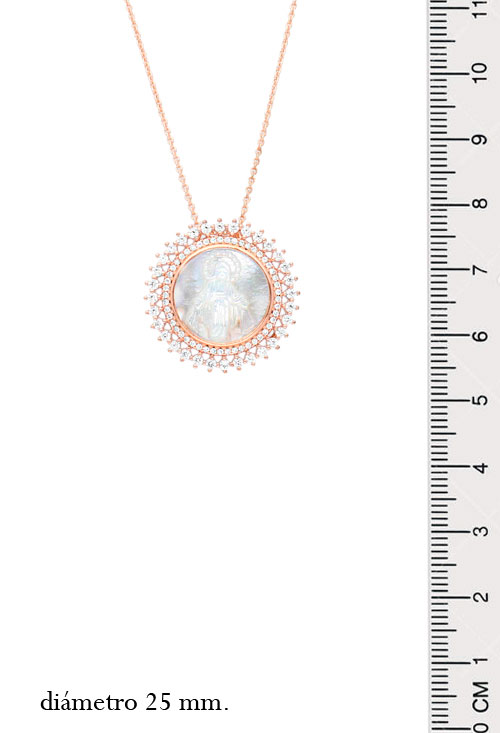 Medalla nácar doble orla circonitas plata de ley chapado rosa, medalla de forma circular realizada en camafeo de madre perla representando la imagen de la Virgen Milagrosa, esta perimetrada por una doble orla de fantasia con circonitas engastadas en garras individuales, la medalla trae incluida una cadena de eslabones forzados también realizada en plata de ley chapada en color oro rosa.