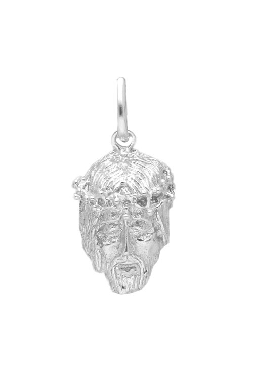 Medalla religiosa Santa Faz plata de ley, vista frontal del rostro de Cristo crucificado con corona de espinas, tecnica de trabajo fundicion con acabado brillo.