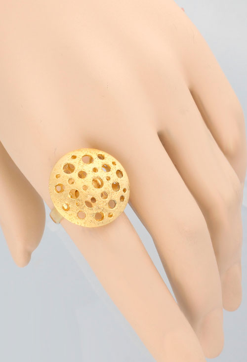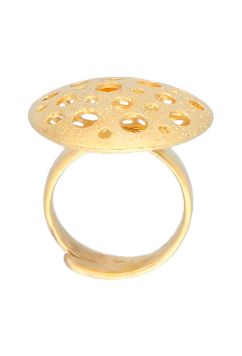 Anillo plata chapada color oro amarillo, motivo circular con calados circulares y brazo abierto que permite adaptar el anillo a diferentes tallas.