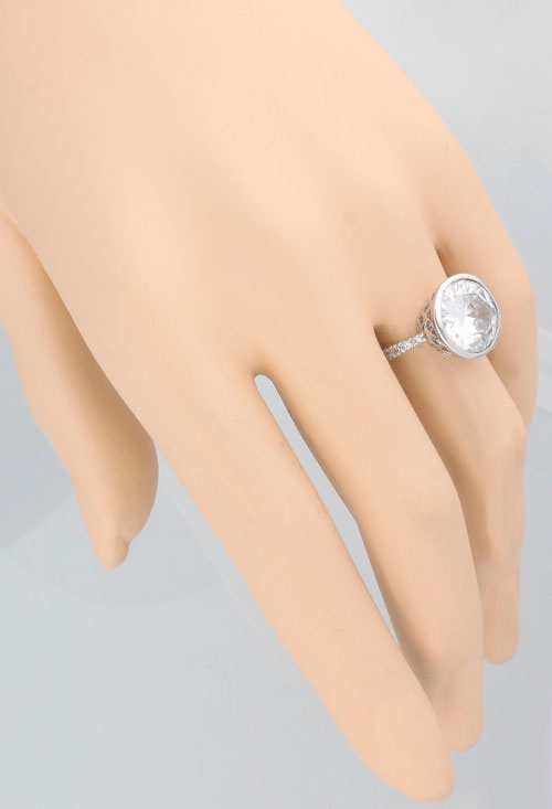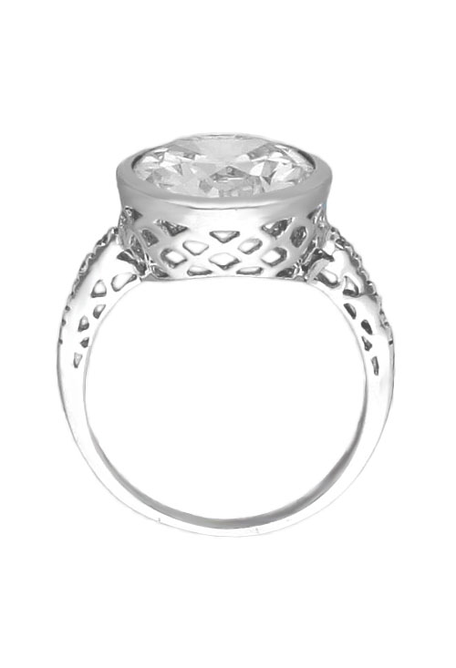 Sortija de plata con circonitas, original modelo en el que el protagonista principal es una circonita talla brillante de 10 milímetros de diámetro engastada en una boquilla tan alta como la culata de la piedra y siempre calada para dejar atravesar la luz y dejar brillar la piedra con toda su intensidad.