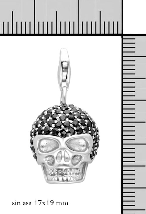 Colgante de plata con forma de calavera cuyo cráneo esta cuajado con circonitas de color negro, precioso y espectacular colgante que puede llevar todo tipo de personas aunque suele ir acompañando a looks más masculinos y urbanos tambien looks punk y goticos.