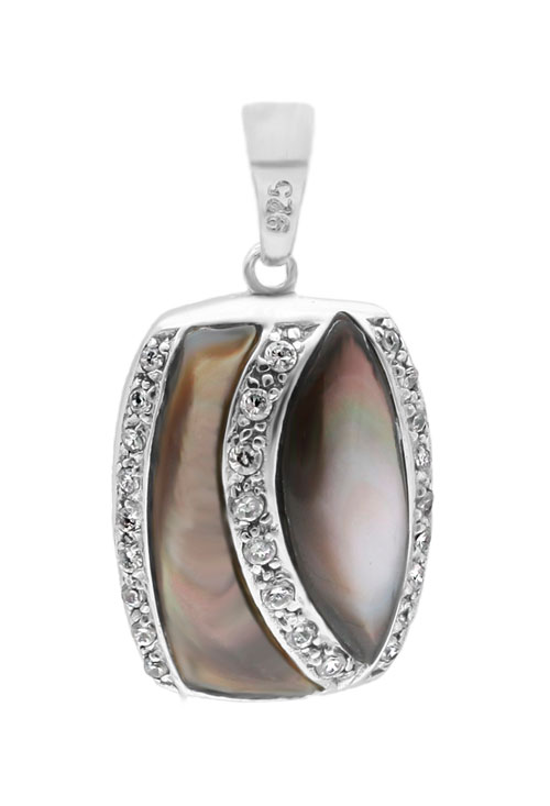 Colgante plata ley 925 milésimas con forma de tonel adornado con 2 galerías de circonitas y dos formas irregulares de nácar negro, un bonito motivo para adornar el cuello de la mujer de cualquier edad, un adorno elegante y diferente que solo hasta agotar stock puedes comprar en nuestra joyería online a un precio muy muy barato.