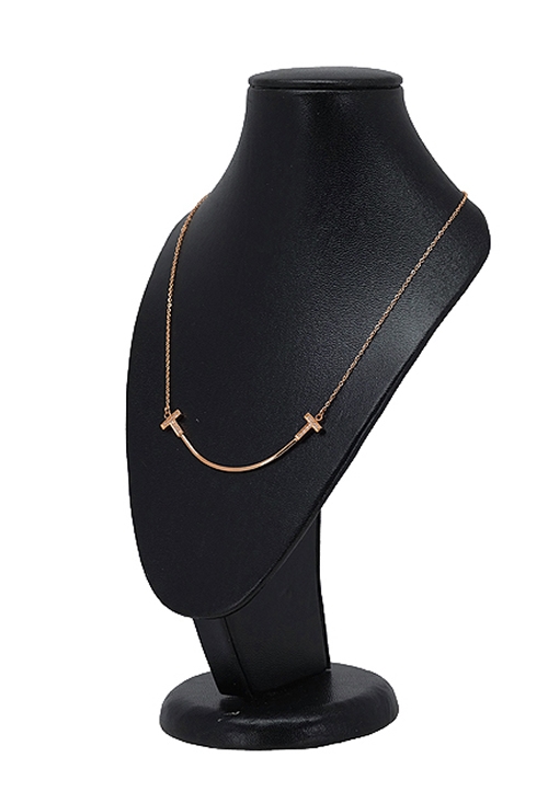 Gargantilla en acero chapado en color oro rosa con motivo curvo terminado con cruces adornadas con circonitas, collar para señora con cadena de eslabón forzado de 40 a 45 centímetros, un precioso regalo al mejor precio, disponible venta online con diferentes acabados, consulte sin compromiso. Grupo de colgantes y collares para mujer en acero.