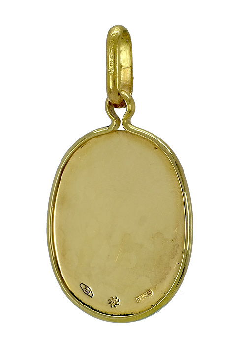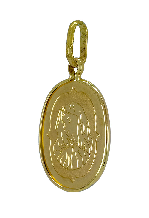 Medalla Comunión de oro amarillo de 1ª ley con la imagen de la Virgen Maria, el colgante de forma ovalada mide 15*19 mm. y pesa 2,70 gr. es una medalla muy indicada como obsequio de Primera Comunión. Se puede grabar por el reverso. Disponibilidad de todo el santoral y todos los tamaños, consulte sin compromiso.