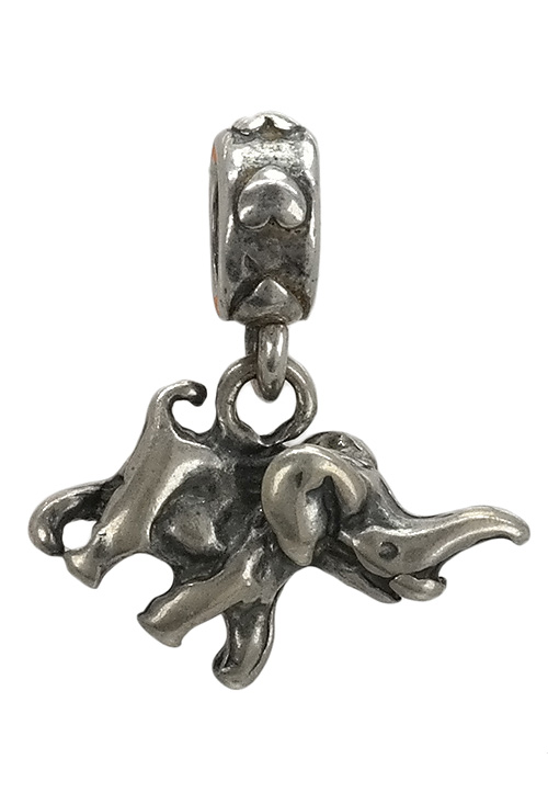 Abalorio de plata 925 milésimas que representa la figura de un elefante barritando con la trompa hacia arriba lo que es símbolo de buena suerte, el elefante cuelga de una abrazadera que se introduce en tu pulsera quedando el motivo colgando de la misma, es un pequeño regalo que se convierte en un magnifico recuerdo. Mide 16×19 milímetros y pesa 3,10 gramos.