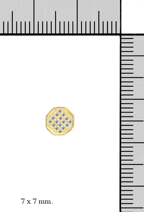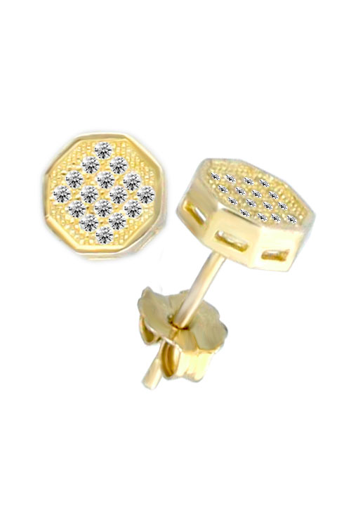 Pendientes de plata chapada IP amarillo con circonitas, bonito diseño de forma hexagonal cuajada de circonitas con palillo y sistemas de presión, pendiente muy ponible, muy cómodo y fácil de combinar que no te importara llevarlo puesto a diario, no desaproveches la ocasión quedan muy pocas unidades, precio especial jouería online.