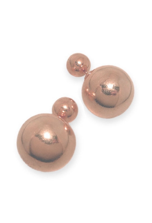 Pendientes plata chapada en color oro rosa, oportunidad outlet de joyería, diseño inspirado en modelos de grandes marcas, la bola de mayor tamaño mide 16 milímetros de diámetro y queda en la parte trasera de la oreja siendo la más pequeña la que queda en la parte delantera del lóbulo.