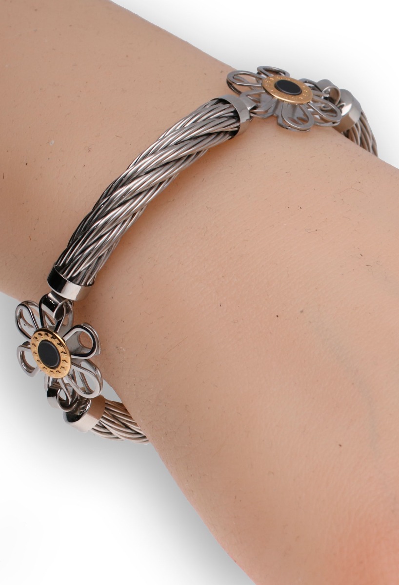 Pulseras acero y oro margaritas 18kts, pulsera semirígida con Brazalete acero y oro ley margaritas con ónix. esta pulsera tiene un grosor de 6mm. Y el motivo en forma de margarita tiene 18 mm.Regalo ideal para cualquier ocasión.Los mejores precios en nuestra tienda online.