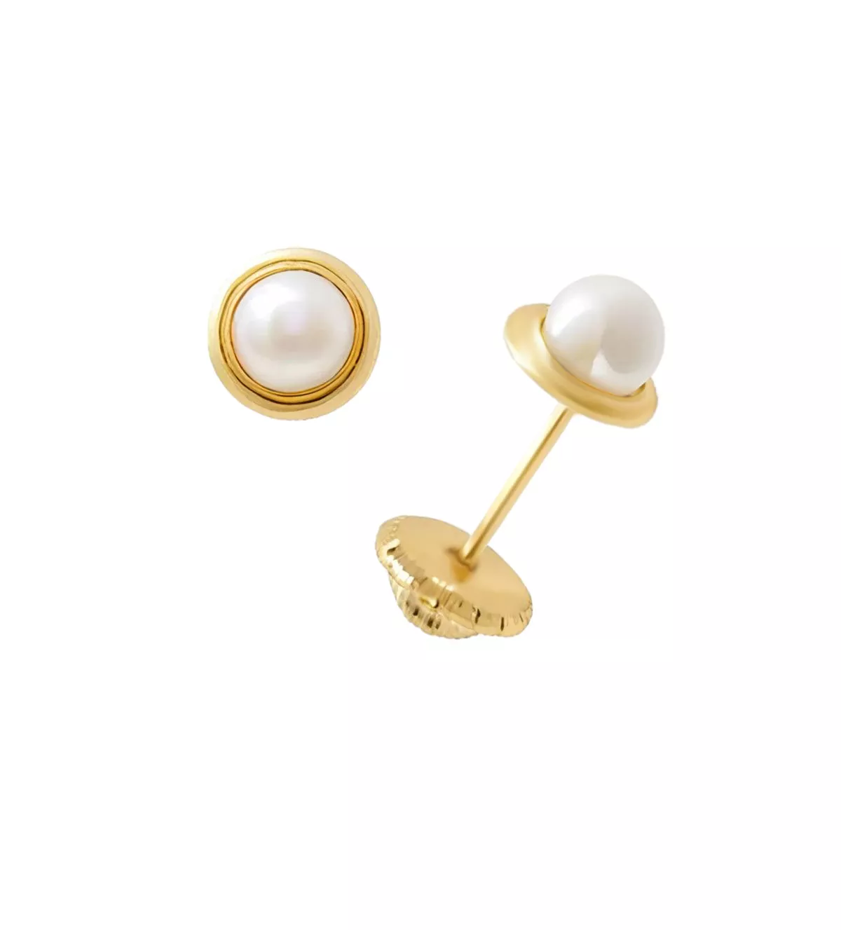 El diseño de estos pendientes se caracteriza por un bisel de oro que rodea cada perla, destacando su brillo y proporcionando un acabado sofisticado. El cierre de seguridad a rosca asegura que los pendientes se mantendrán firmemente en su lugar, incluso durante el sueño o el juego. Además, su tamaño pequeño y ligero asegura que tu bebé apenas notará que los lleva puestos.