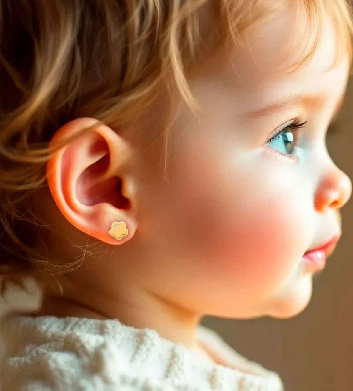 El diseño está pensado para ser suave al tacto, sin aristas ni bordes que puedan molestar. La forma redondeada de los pétalos y el acabado pulido garantizan una estética armónica y encantadora, perfecta para el lóbulo de una bebé.