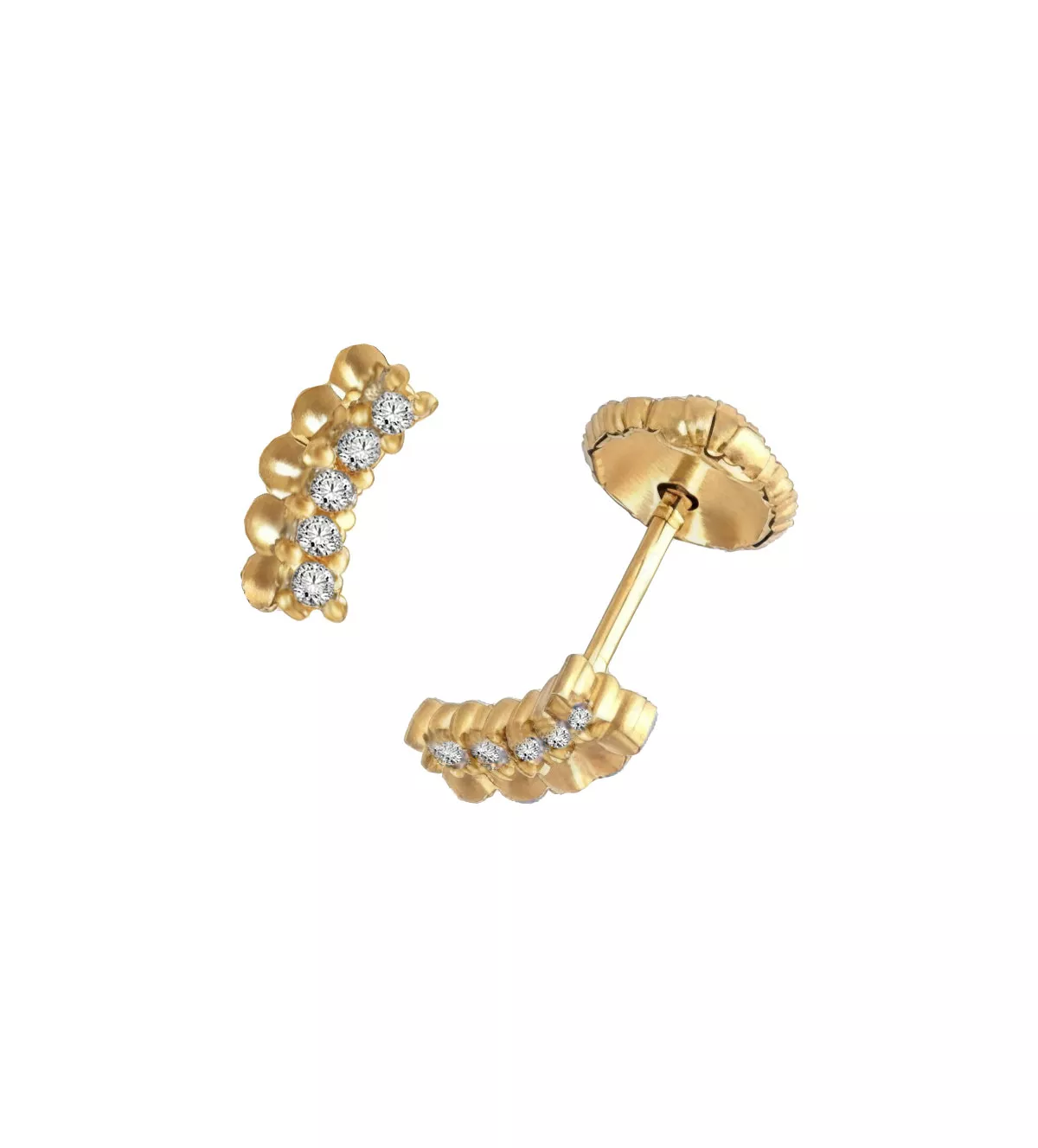 El diseño de estos pendientes de bebé se destaca por su sofisticada curva en forma de paréntesis, que combina una línea de oro amarillo con una fila de circonitas. Esta disposición crea un juego de luces que atrae la atención sin ser demasiado ostentoso, ideal para la delicadeza de un bebé. La fusión del oro con las circonitas proporciona un equilibrio entre lo clásico y lo moderno, haciendo de estos pendientes una pieza atemporal que puede ser usada en diversas ocasiones.