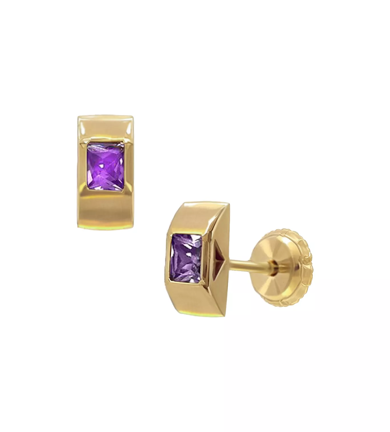 ¡Deslumbra con estos delicados pendientes de bebé! Fabricados en oro amarillo de 18 quilates, estos pendientes de oro presentan una elegante amatista rectangular enrasada en su centro. Diseñados para máxima comodidad y seguridad, cuentan con palillos de rosca y tuercas con tope, ideales para bebes o niñas pequeñas. Un regalo perfecto que no solo es bonito, sino también asequible.