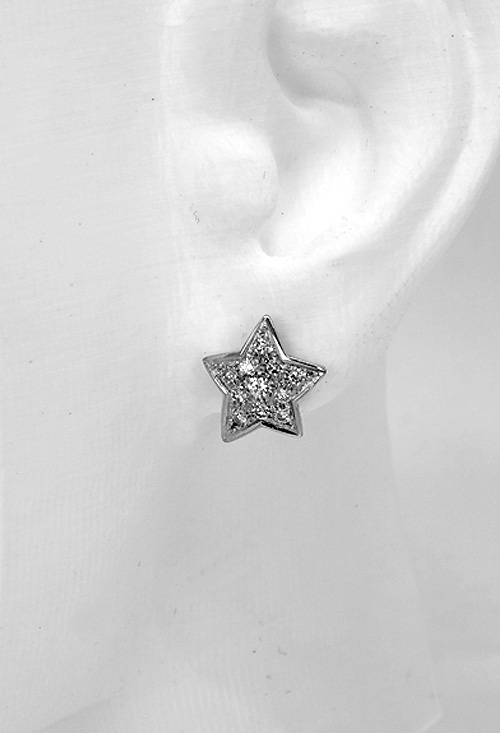 Pendientes de oro blanco 18 ktes con diamantes modelo estrella irregular de 5 puntas con la superfie bombe toda adornada con pavé de diamantes, en realidad cada pendiente lleva un diamante talla brillante central de 0.05 quilates rodeado por otros diez de menor tamaño cada uno 0.025 quilates, se remata esta bella joya con un pernio y sistemas de presión reforzados con volante, muy cómodo y fácil de poner y quitar pero muy seguro gracias al anclaje que hace de tope para que la presión no pueda salir del pernio accidentalmente.