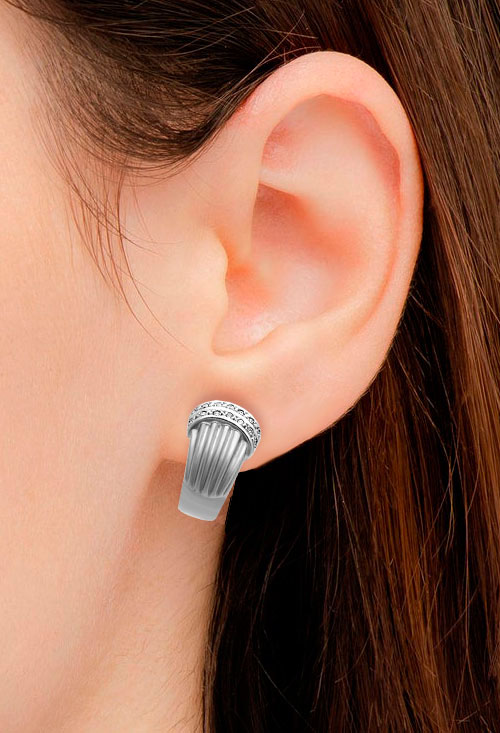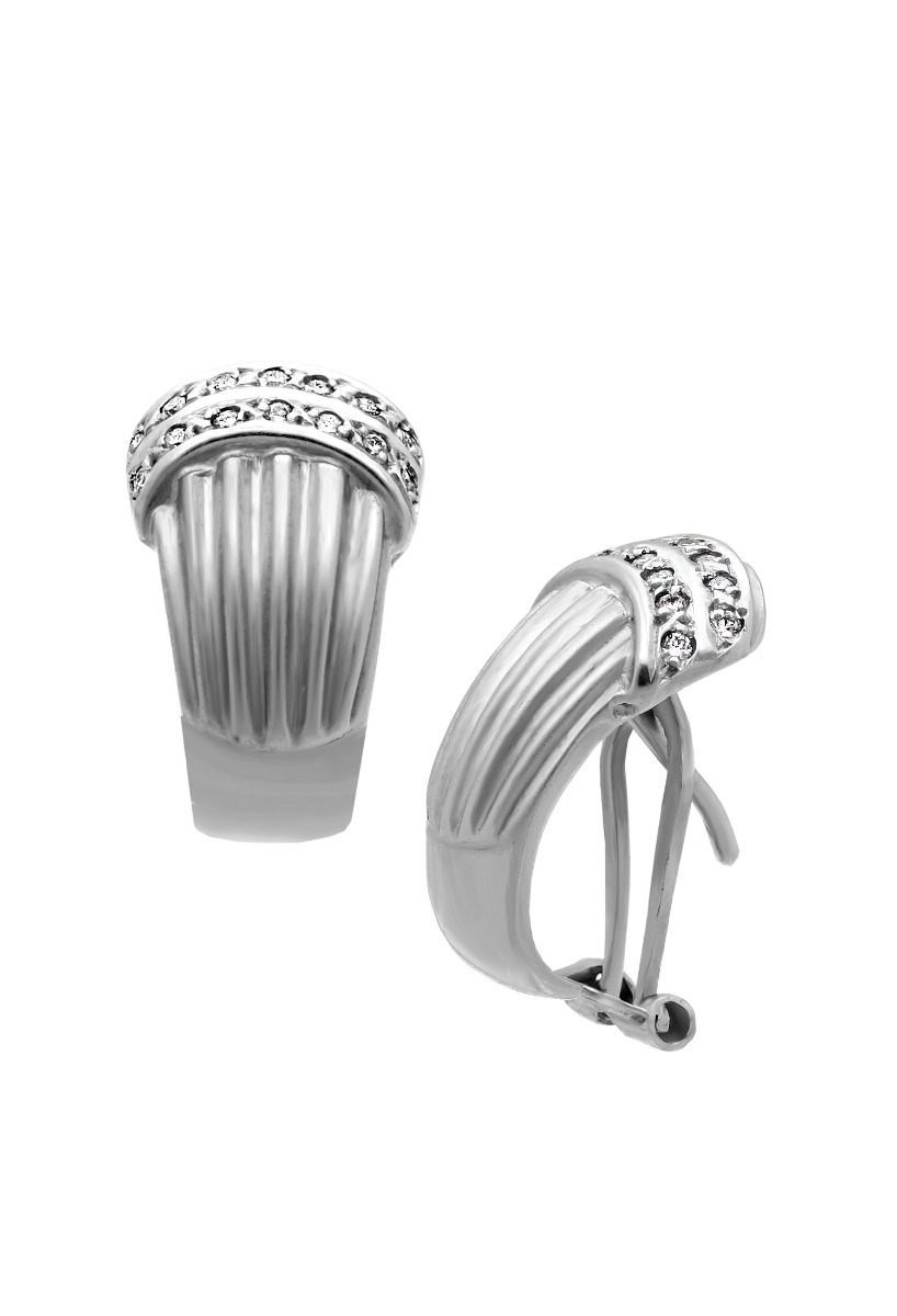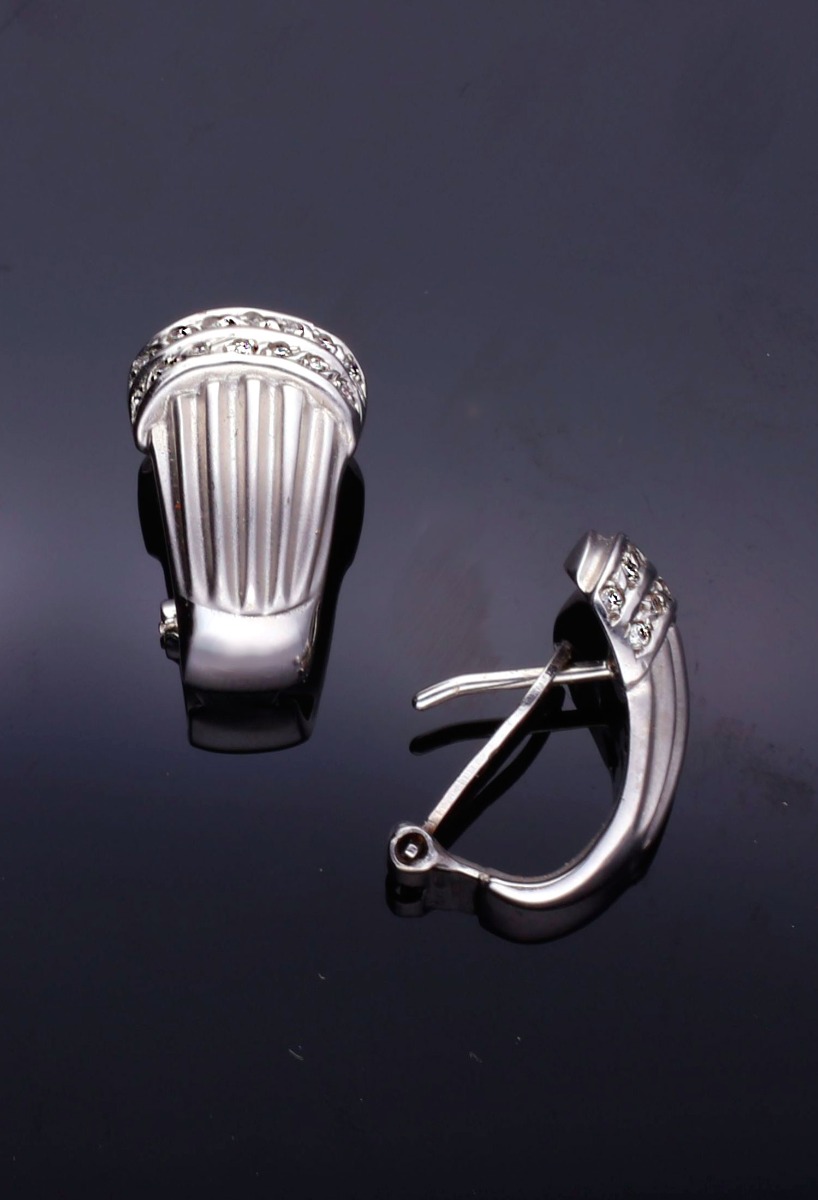 Pendientes de oro blanco 18 kilates con diamantes, precioso diseño acabado mate y brillo abanico de gallones con remate de ondas con diamantes talla brillante, estos aretes se ajustan a la oreja mediante sistemas omega que además de simplificar la acción de poner y quitar y dar mucha seguridad, consiguen ajustar perfectamente pegado el pendiente al lóbulo de la oreja de la forma más favorecedora.