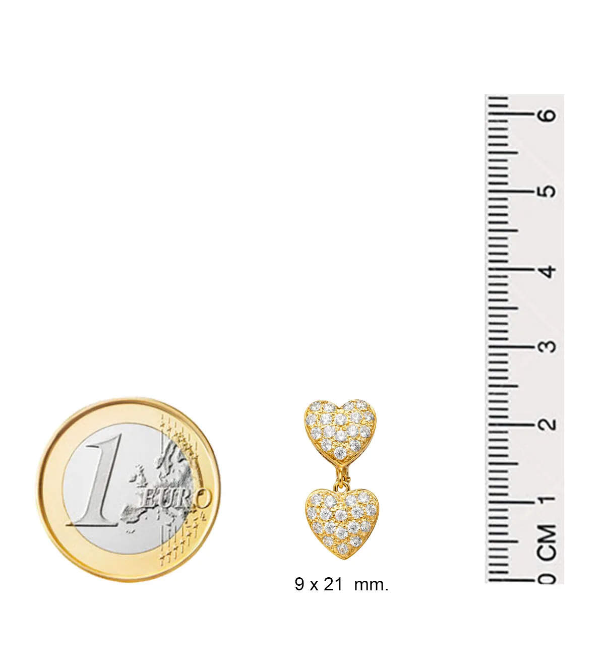 El diseño presenta dos corazones convexos unidos en forma alargada, aportando movimiento y elegancia al rostro. La forma convexa añade volumen y profundidad, creando un juego de luces que realza el brillo de las circonitas.