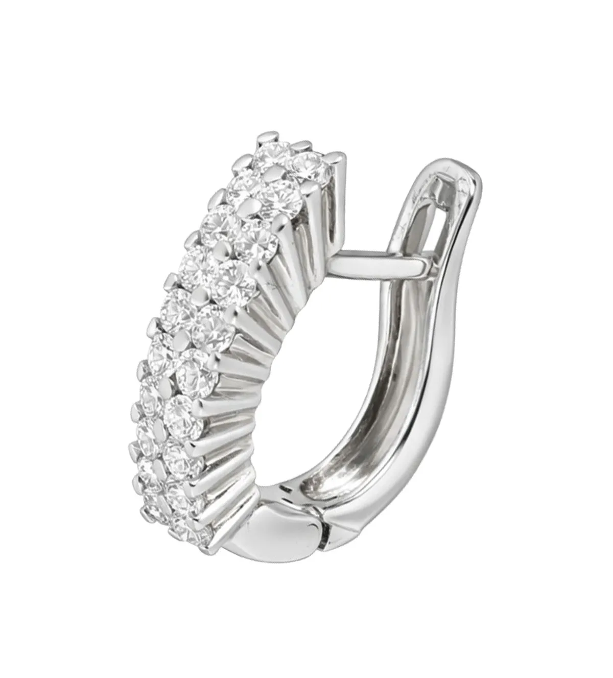 El diseño de estos pendientes de oro destaca por su estructura de arete con doble galería paralela, una composición elegante y equilibrada que aporta profundidad y presencia sin resultar excesiva. Cada diamante está engastado en garras individuales, permitiendo que la luz incida directamente sobre la piedra y maximice su brillo natural.