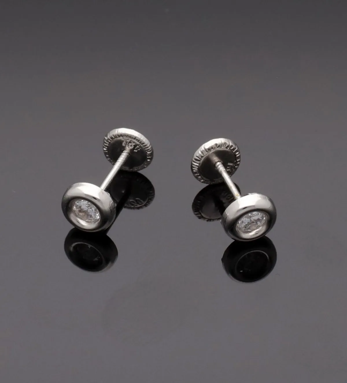Pendientes de oro para bebe que te los puedes poner a cualquier edad y que enamoran al instante. Realizados en elegante oro blanco de 18 quilates y delicadas circonitas, su diseño aporta distinción y seguridad gracias al cierre de rosca con tope. Un regalo perfecto que simboliza pureza y amor, ideal para bautizos y ocasiones especiales. ¡No pierdas la oportunidad de obsequiar estas joyas únicas! Stock limitado y disponibilidad inmediata. ¡Compra ahora y celebra momentos inolvidables!