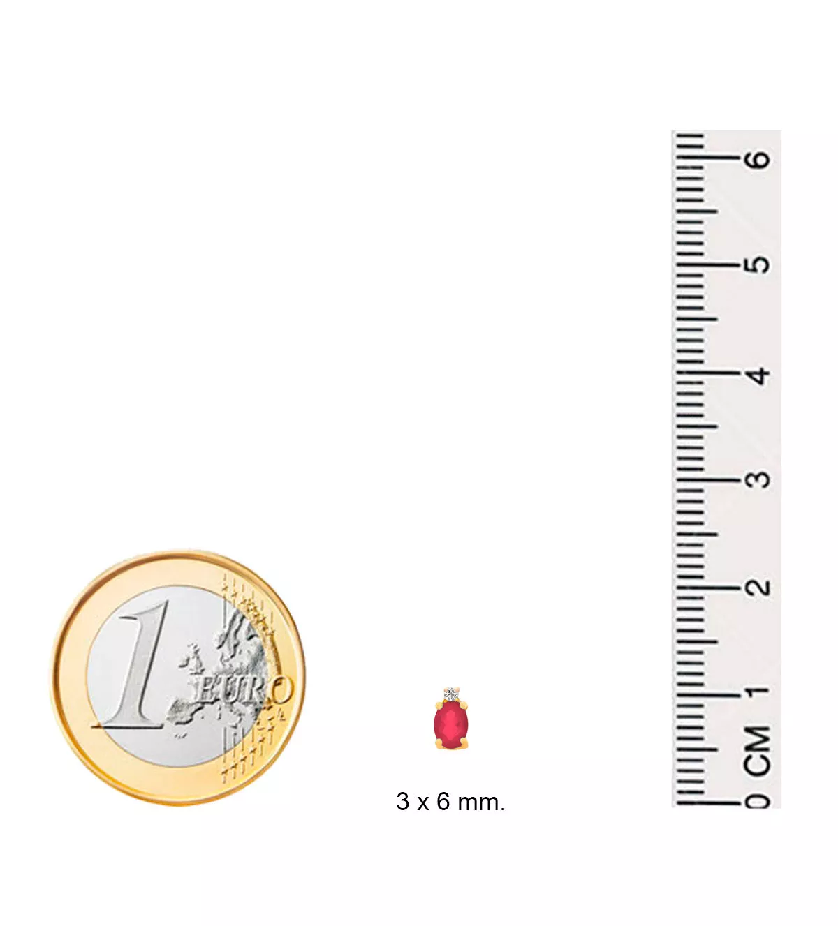 | Características Piedras | 2 diamantes talla brillante de 0,008 ct. cada uno color H pureza VS 2 rubíes talla oval de 3×4 mm. |