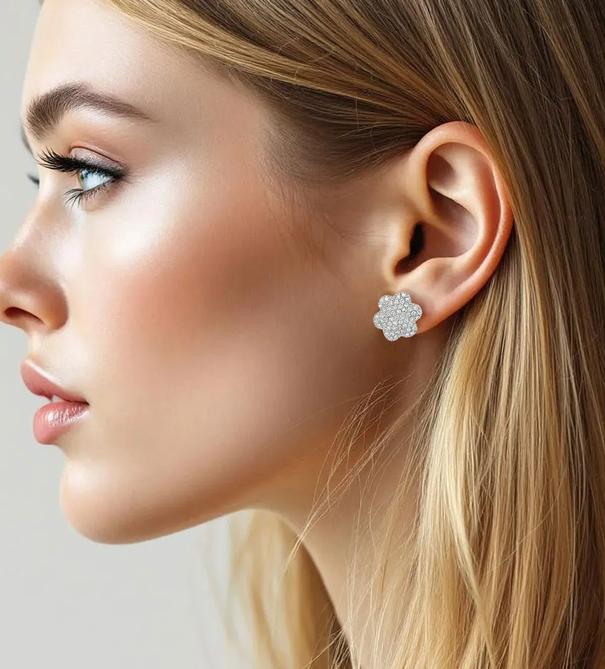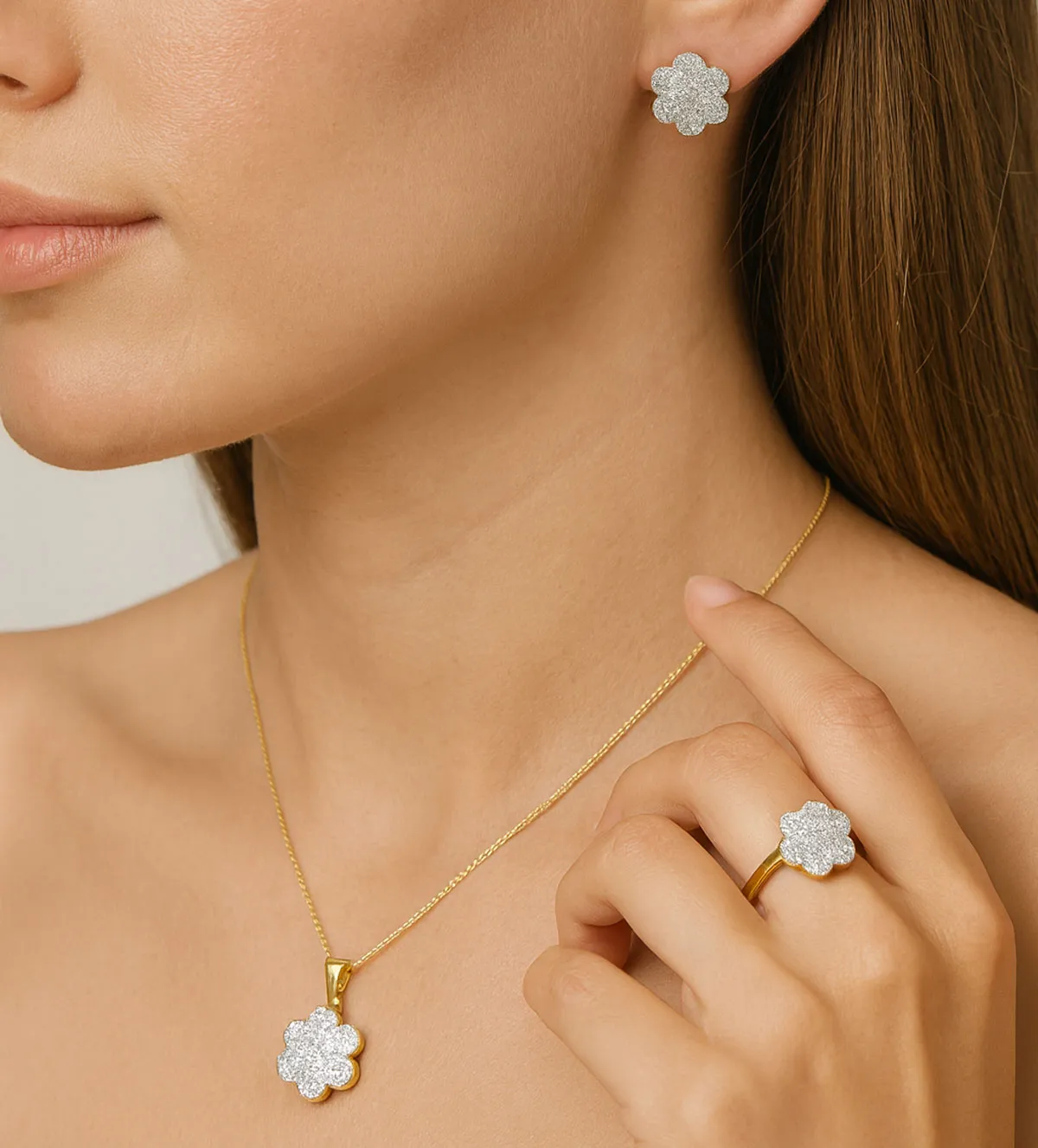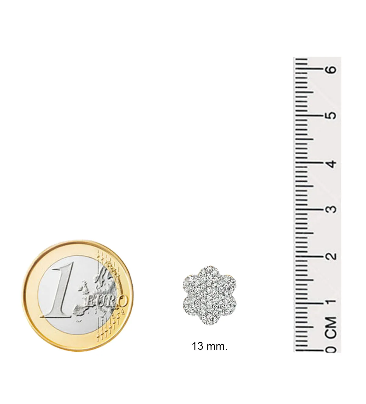 Su diseño en forma de flor de seis pétalos simboliza armonía y feminidad. El frontis brillante resalta gracias al engaste de circonitas, que aportan un brillo similar al diamante, mientras que el oro amarillo de la parte posterior añade equilibrio visual y elegancia. El cierre omega no solo asegura un ajuste perfecto, sino que también aporta comodidad durante horas de uso.