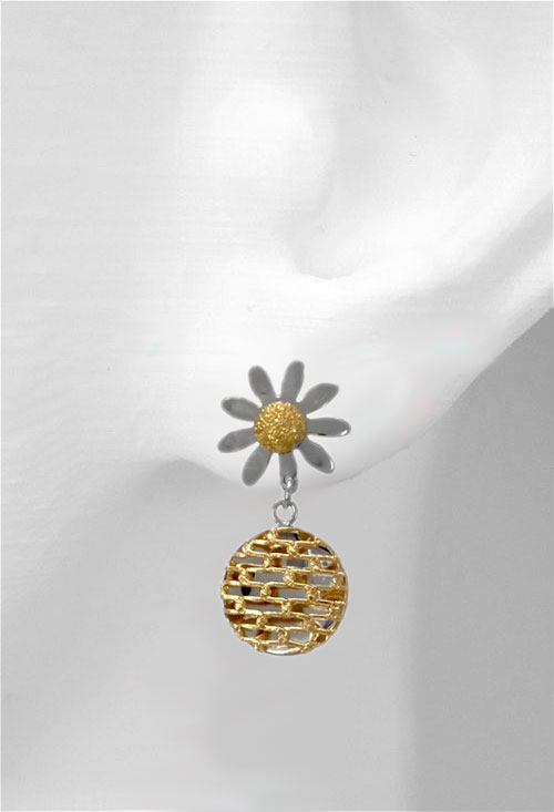 Pendientes largos de mujer realizados en oro 1ª ley 18 kilates, es un diseño en el que una esfera de oro blanco cubierta por una especie de parrilla de oro amarillo que mide 12 milímetros de diámetro cuelga de un tramo sujeto a una margarita también de oro blanco y oro amarillo, lleva sistemas de presión y de largo mide 26 milímetros, tiene un peso de 3,60 gramos. Precioso modelo que te ayuda a lucir esplendida en todo tipo de ocasiones.