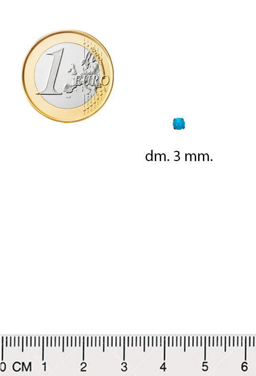 Pendientes oro amarillo 18 kilates (primera ley) para recien nacida, modelo clásico con turquesa tallada en forma esferica cogida por una garra de cuatro patas a un pernio de rosca con tuerca artesanal reforzada realizada con terraja que enrosca por su base de oro a diferencia de las que te ofrecen generalmente que enroscan en una resina interior que rellena la tuerca.