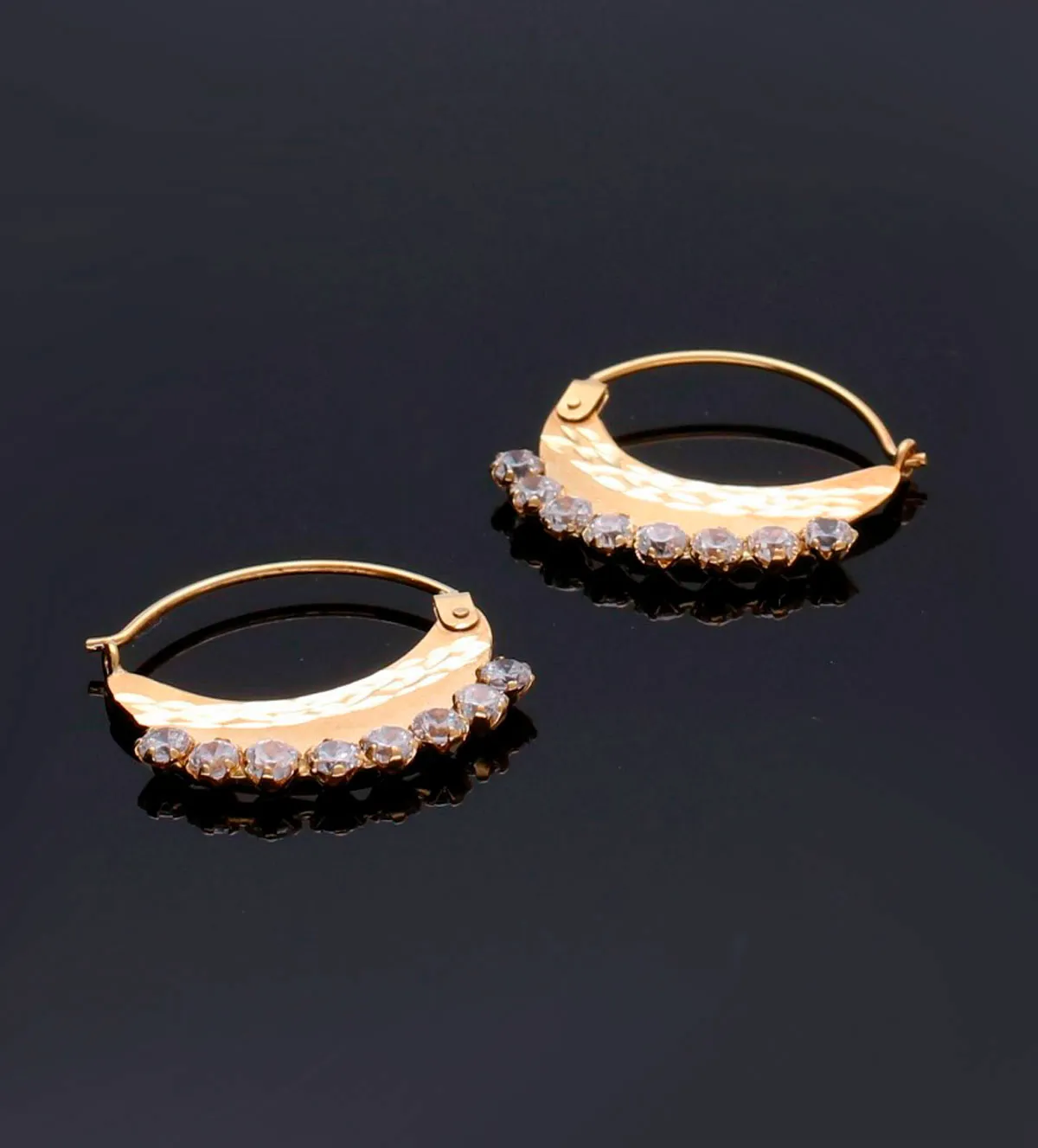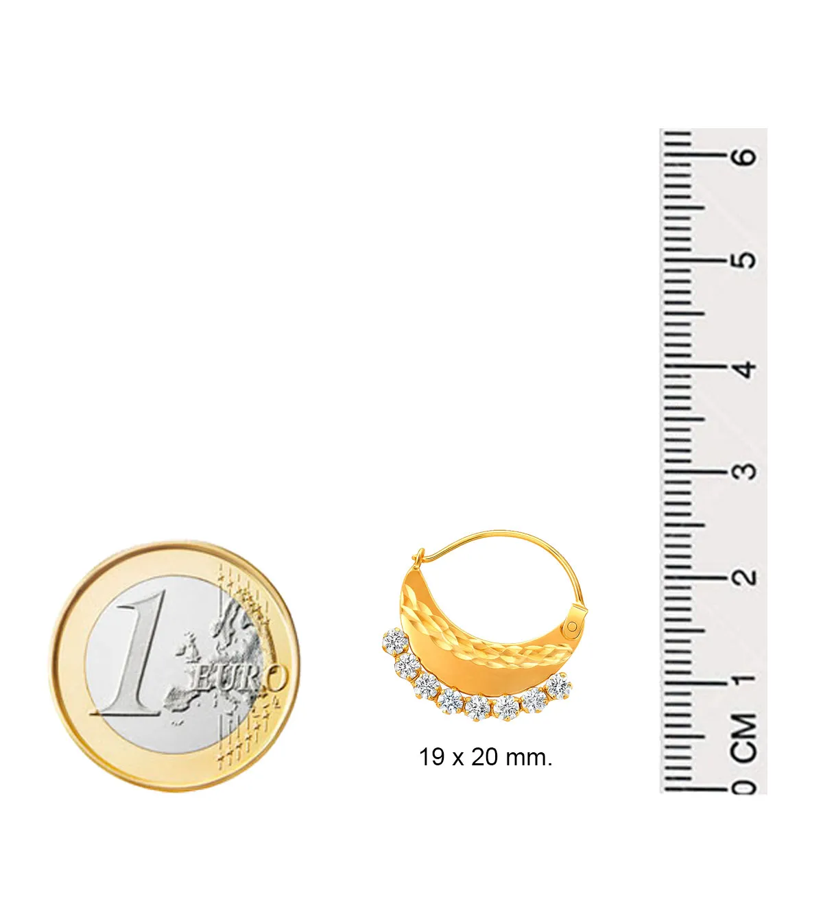 Pendientes de oro que deslumbran con cada movimiento. Elaborados en oro amarillo de 18 ktes, combinan el encanto clásico de la criolla con un diseño charro de circonitas engastadas y adornos lapidados. Ligeros, cómodos y radiantes, aportan un brillo único que realza cualquier look. Una joya imprescindible en tus momentos más alegres. Disponibilidad inmediata, haz tu pedido hoy mismo en Rubí Joyeros antes de que el stock limitado se agote.