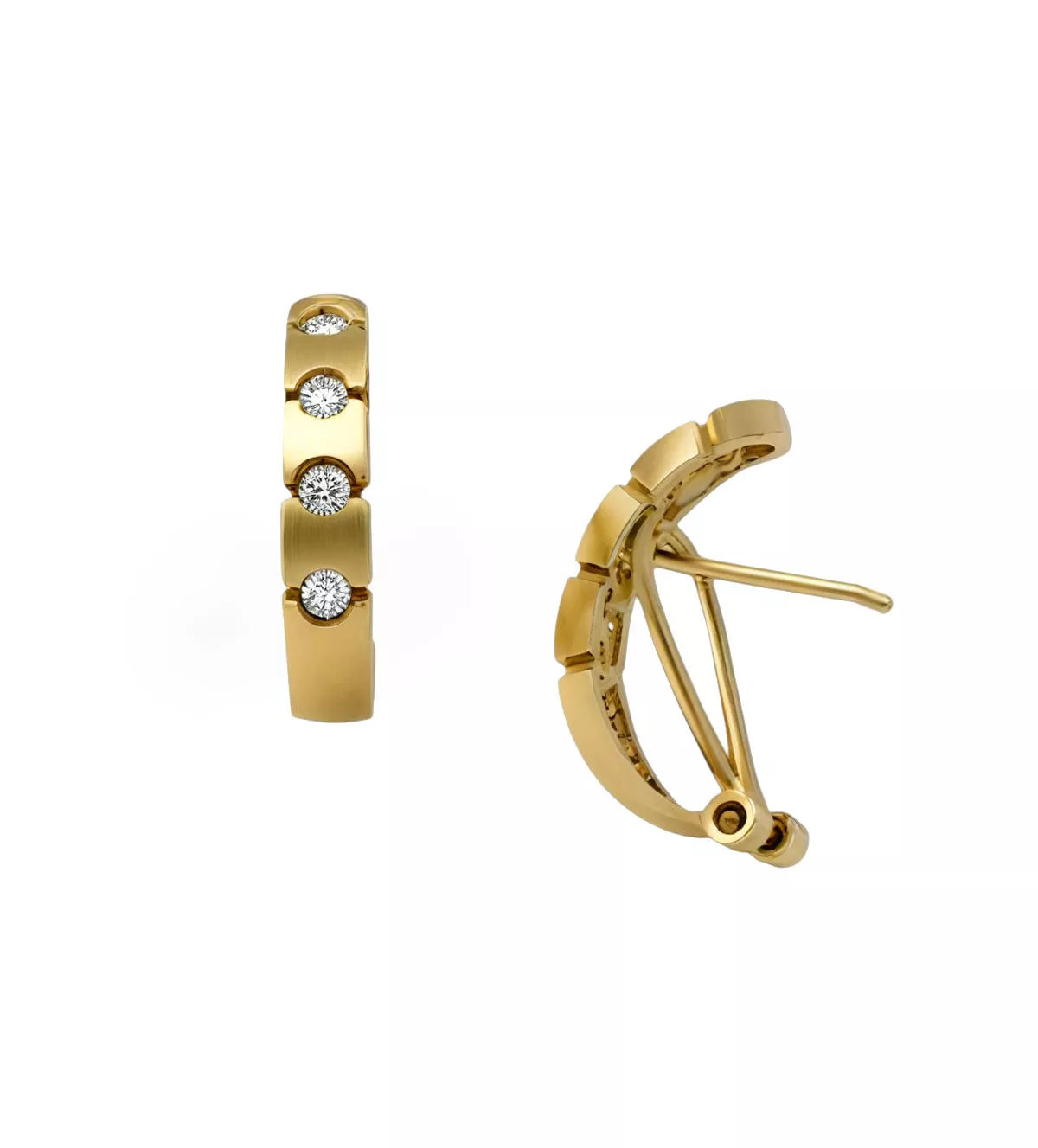 Pendientes de oro de 18K con diamantes deslumbrantes, el modelo “Damon and Co” combina elegancia y sofisticación. Su diseño de banda plana y curva, con diamantes engastados en bajo boquilla, realza su brillo y distinción. Cierre omega para un ajuste seguro y cómodo. Ideales para cualquier ocasión, incluso como pendientes de novia. ¡Llévalos hoy mismo! Stock disponible para entrega inmediata.