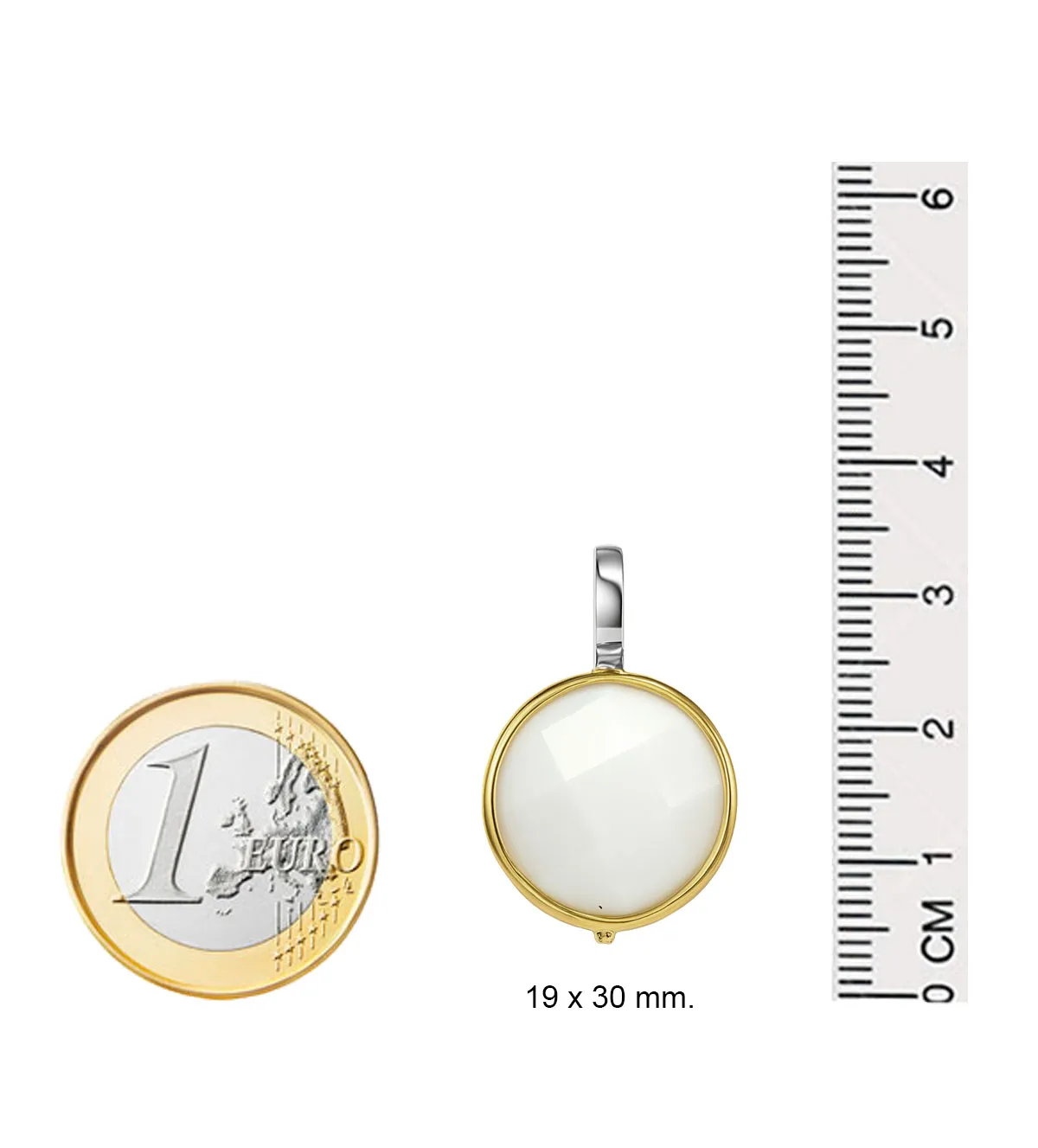 El oro bicolor de 18 kilates ofrece una combinación visual armoniosa: el oro amarillo aporta calidez y luminosidad, mientras que el oro blanco añade un toque contemporáneo y elegante. La ágata blanca, tallada en forma circular y completamente facetada, es una piedra natural que destaca por su pureza y reflejos sutiles.