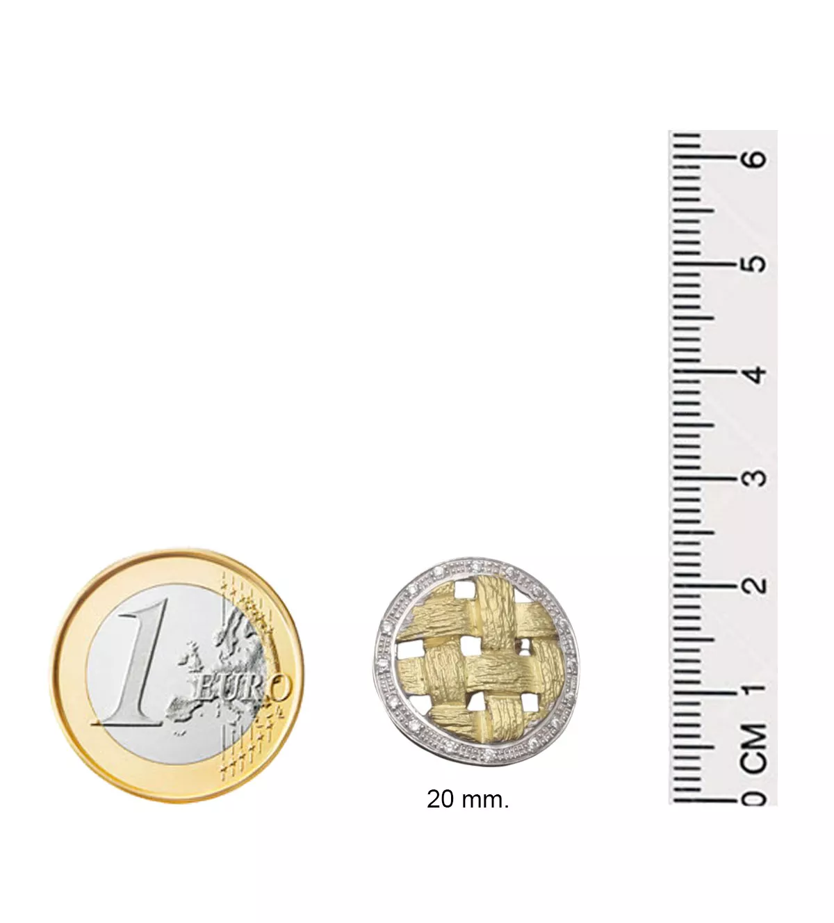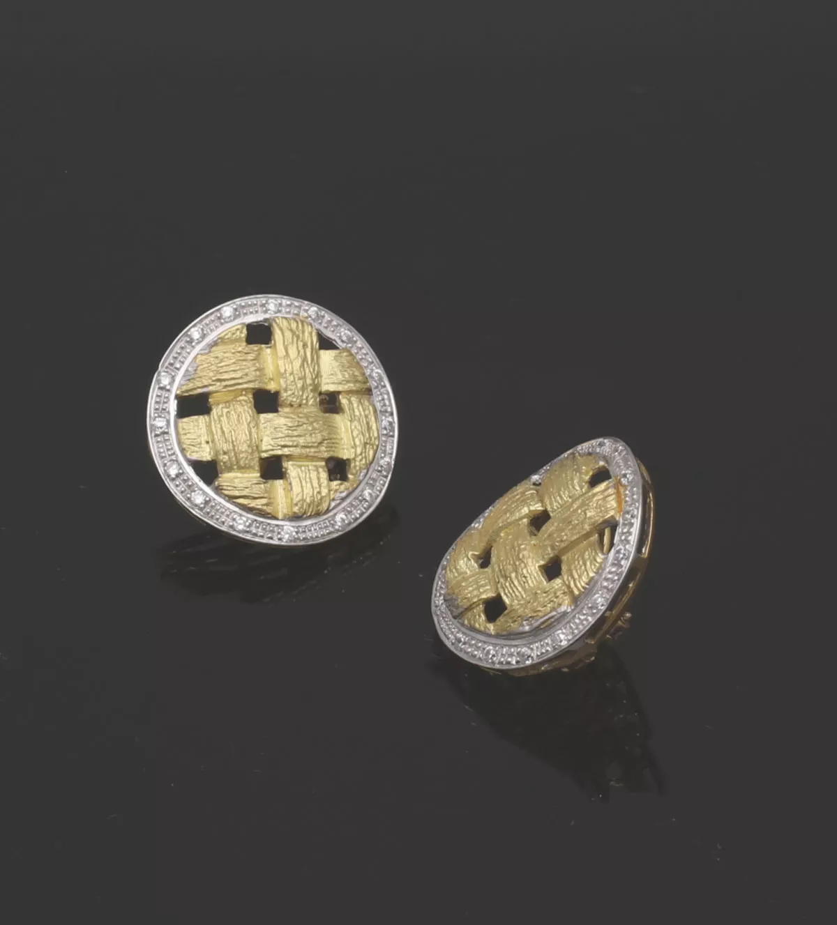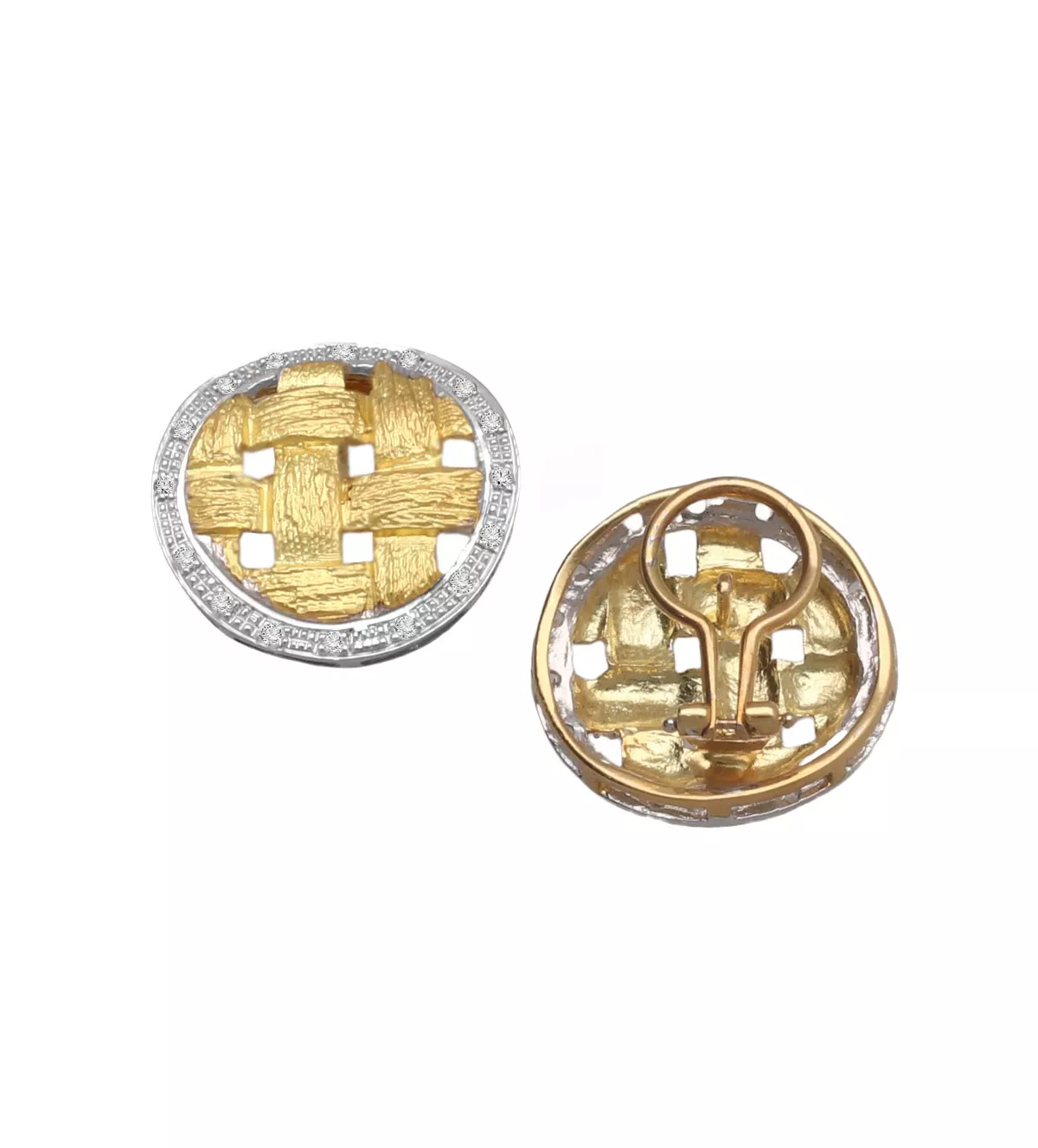 Pendientes de oro bicolor “Mimbre” precioso diseño de alta joyería que combina el tono blanco y amarillo del oro junto a escogidos circones para formar un tejido de mimbre, disponen de sistemas omega.
