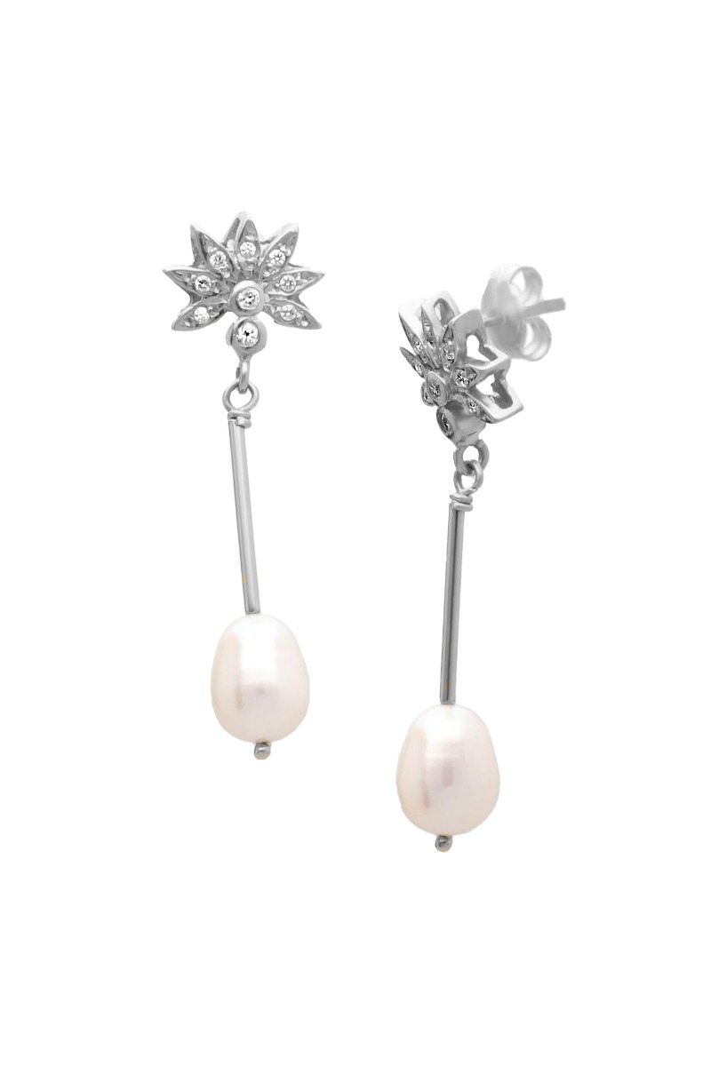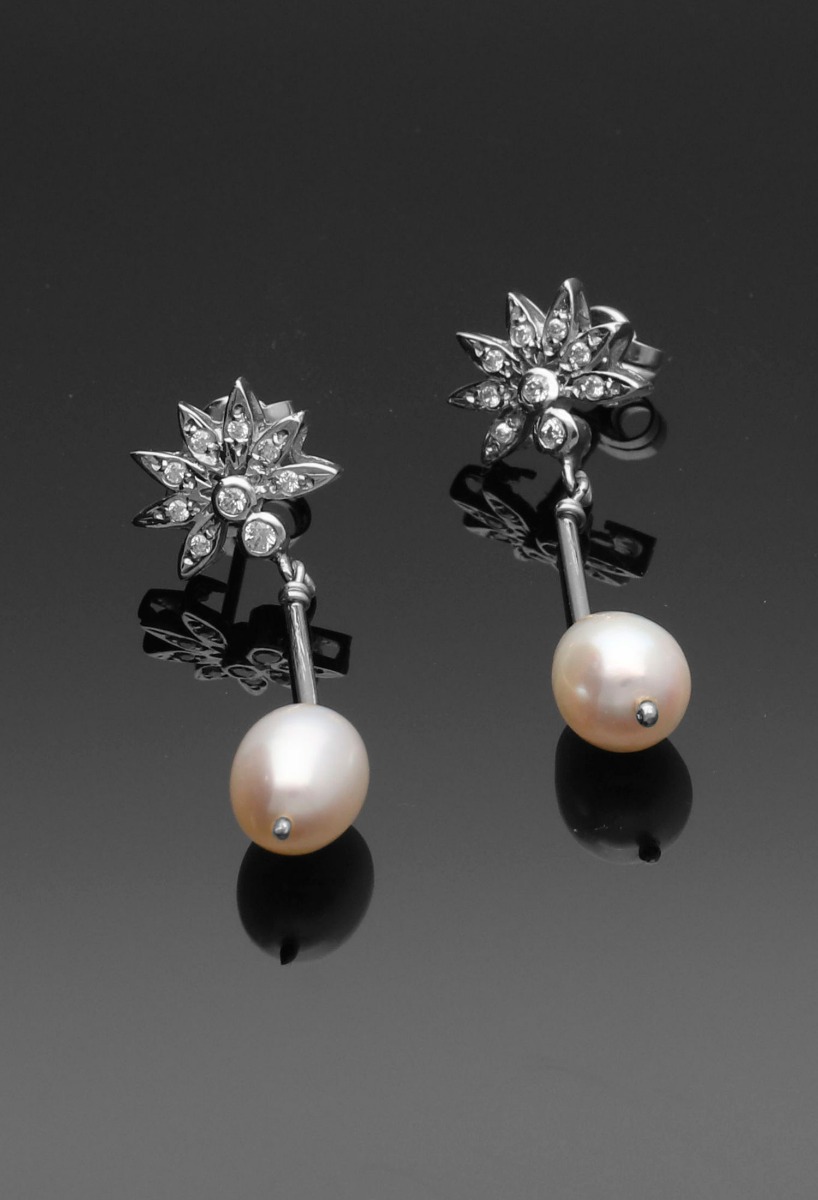 Estos pendientes son verdaderas obras de arte, pendientes elaborados con oro blanco ley 18 ktes. Su diseño cautivador combina perlas cultivadas colgando delicadamente de un hilo cilindrico, junto a un precioso motivo estrella adornado con deslumbrantes circonitas.
