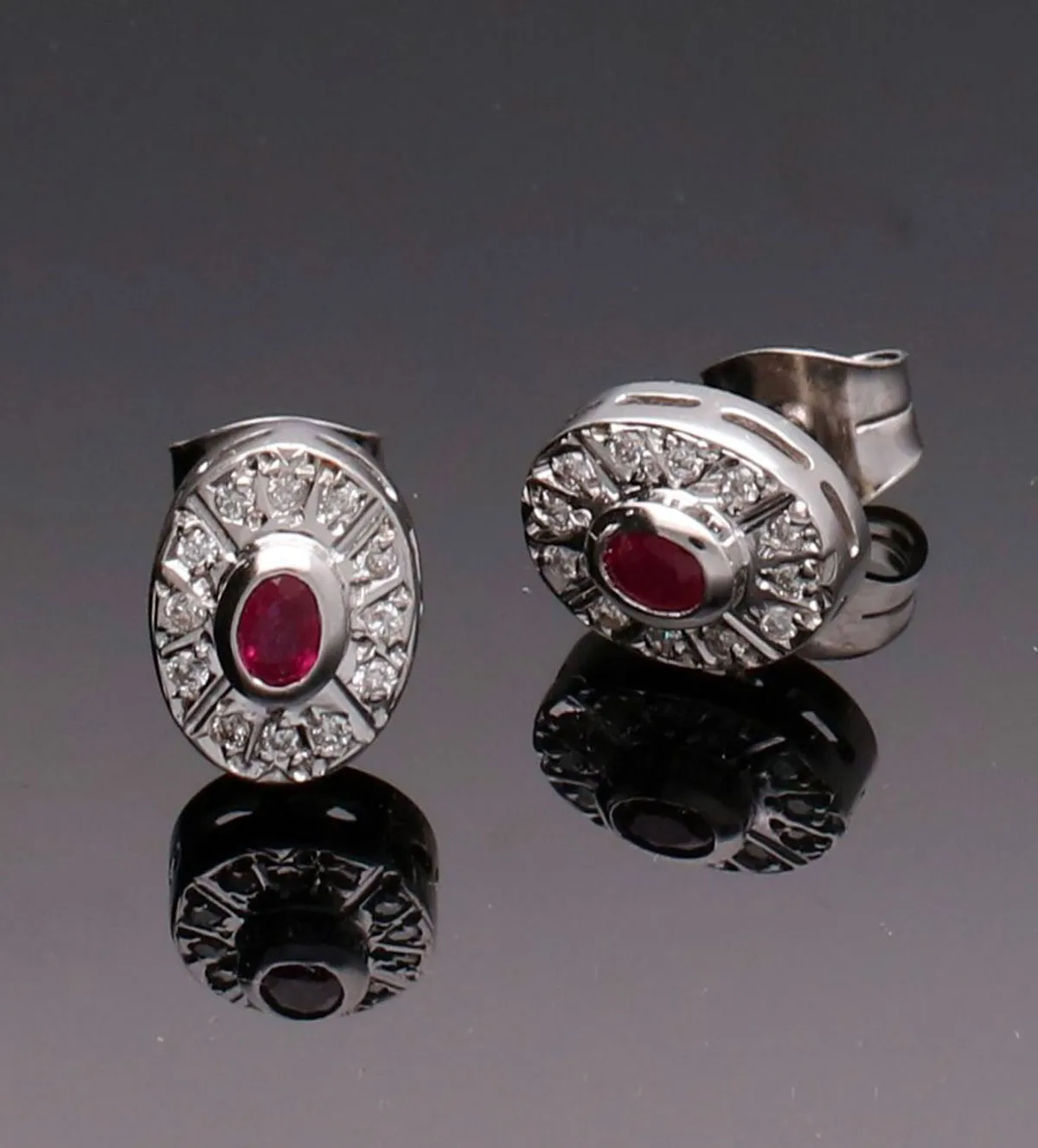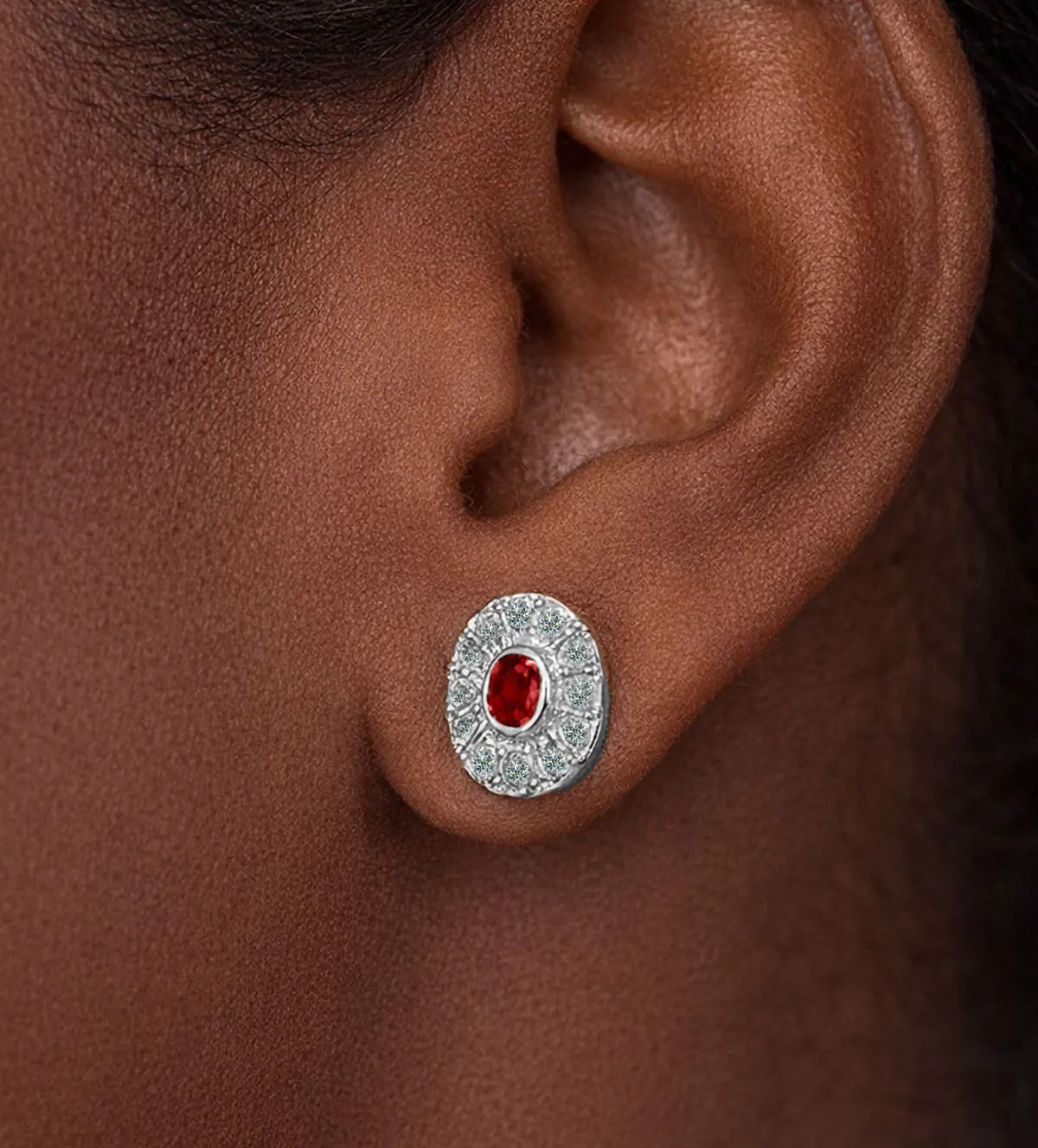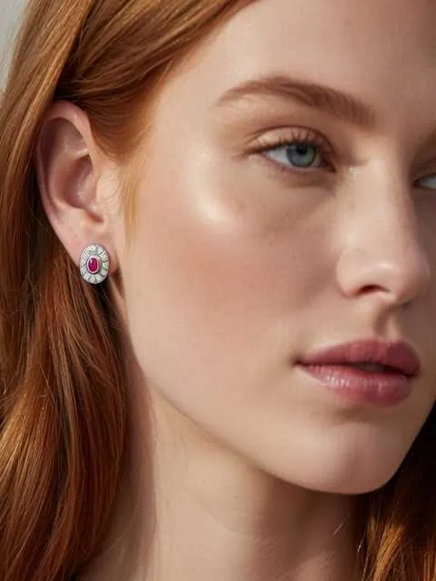 El diseño clásico de estos pendientes se caracteriza por un rubí central de talla ovalada rodeado por una delicada orla de diamantes engastados a ras. Esta disposición crea un efecto visual armonioso que potencia el color de la gema central sin perder equilibrio ni sobriedad. Es un diseño pensado para favorecer el rostro y aportar luminosidad, manteniéndose siempre actual independientemente de las tendencias.