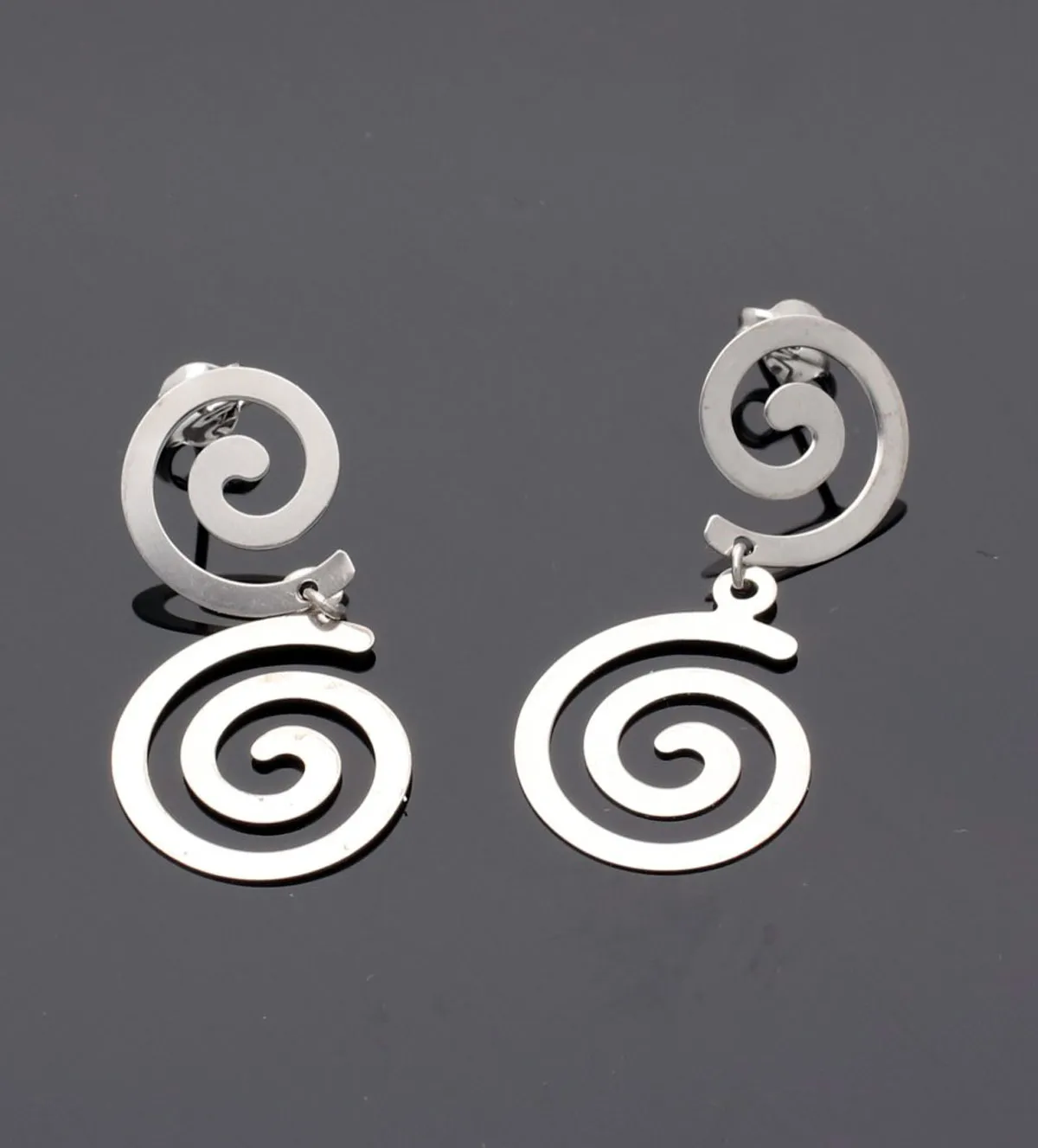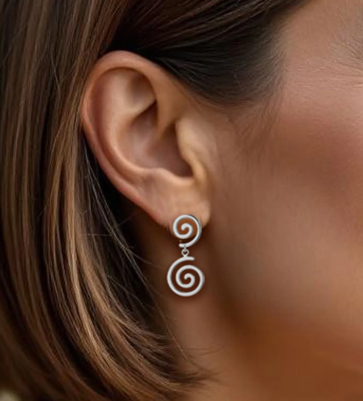 El diseño de estos pendientes es moderno y llamativo: dos espirales colgantes unidas entre sí que aportan movimiento, frescura y un toque artístico. Su estructura ligera permite que se balanceen con naturalidad al caminar, captando la luz desde todos los ángulos. La combinación entre la forma orgánica y el brillo del oro blanco convierte a esta joya en un símbolo de estilo contemporáneo.