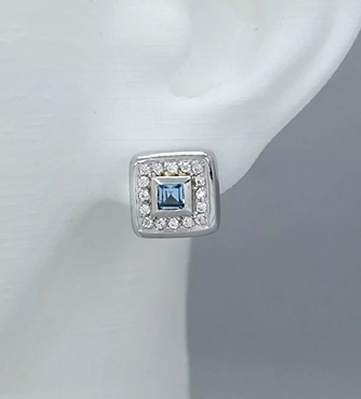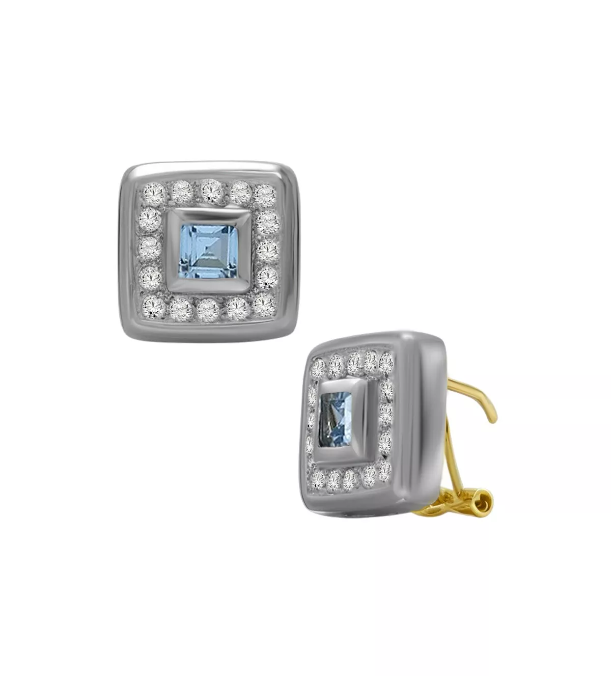 El diseño de estos pendientes es una verdadera obra maestra. Su forma cuadrada, con un topacio azul en el centro, resalta gracias a la delicada orla de circonitas engastadas en galería tipo carril, que crea un juego de luces único. El contraste entre el oro blanco del cuerpo y el cierre en oro amarillo añade un toque de sofisticación y modernidad.
