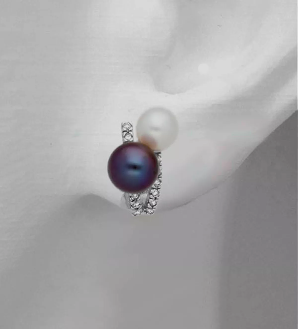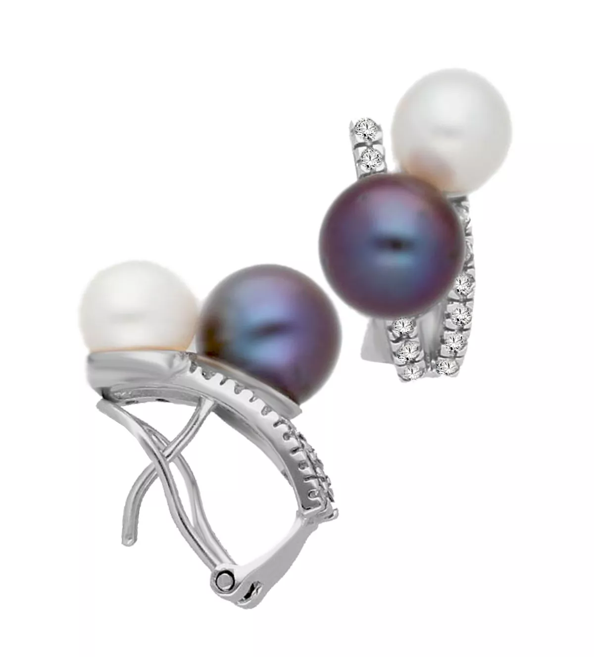 Estos pendientes presentan un diseño único y sofisticado que resalta su exclusividad. Las perlas, una blanca y otra gris con tonos iridiados verdes y azules, descansan sobre galerías engastadas con diamantes que irradian elegancia. Este contraste de colores y texturas los convierte en una pieza única y versátil, ideal tanto para eventos formales como para ocasiones especiales. Perfectos para complementar cualquier look, son una joya que no pasará desapercibida.