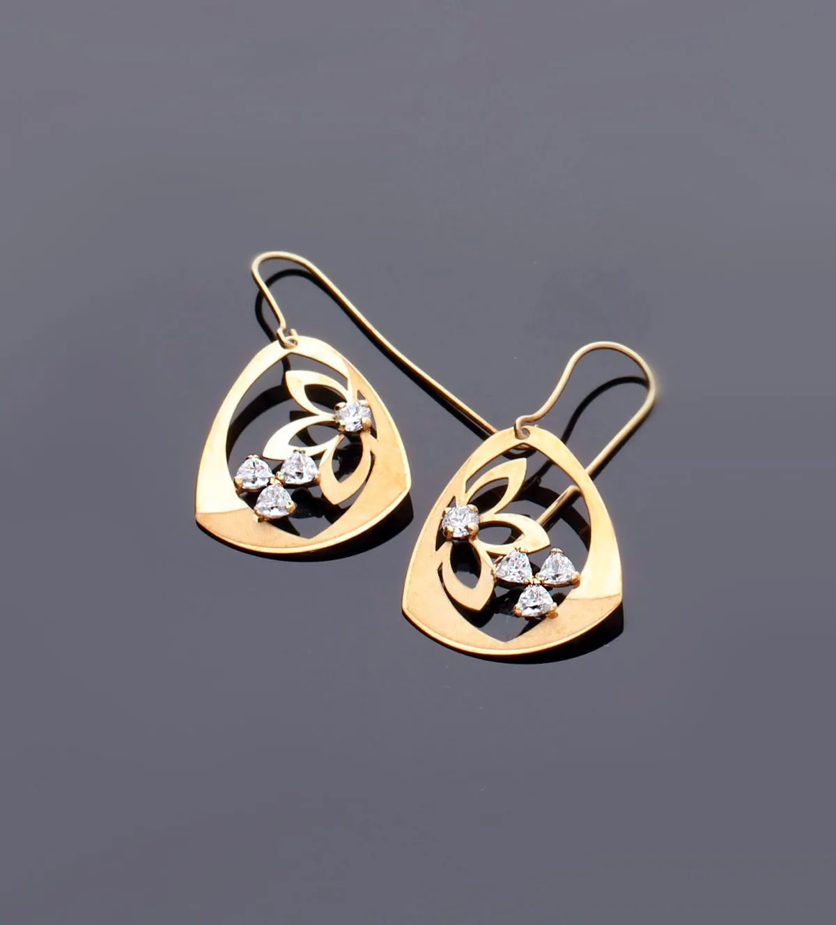 El diseño de estos pendientes de oro es una verdadera obra de arte. Presentan una forma triangular abierta con motivo floral calado, simbolizando frescura, crecimiento y armonía.
