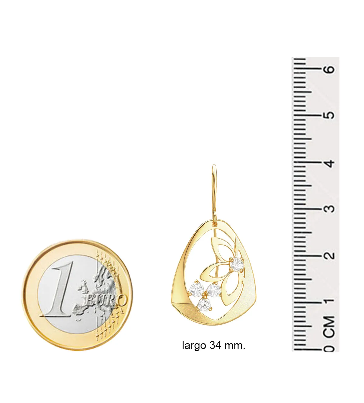 Pendientes de oro largos calados con motivo floral que deslumbran con su elegancia natural. Fabricados en oro amarillo de 18 k, destacan por su brillo, diseño triangular grabado a láser y acabado matizado que resalta su estilo único. Su cierre tipo anzuelo ofrece comodidad y ligereza. Ideales para brillar en cualquier ocasión. ¡Adquiere ahora esta joya exclusiva, última unidad disponible en stock, con envío inmediato desde Rubí Joyeros, la mayor joyería online de España!